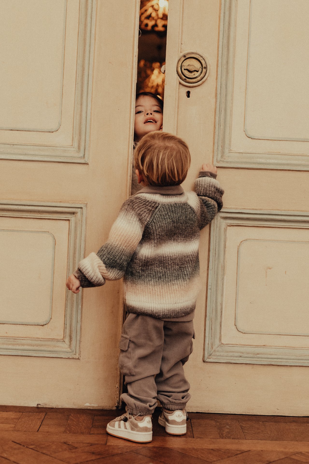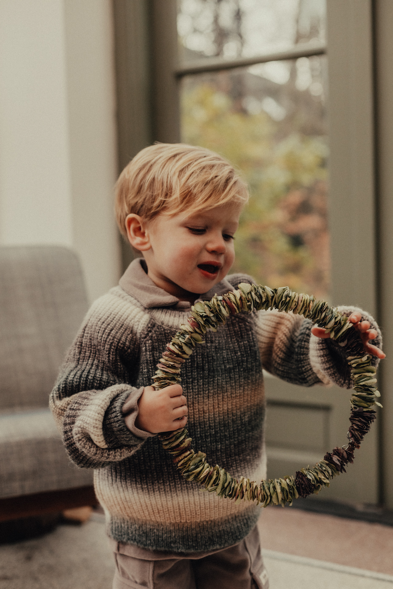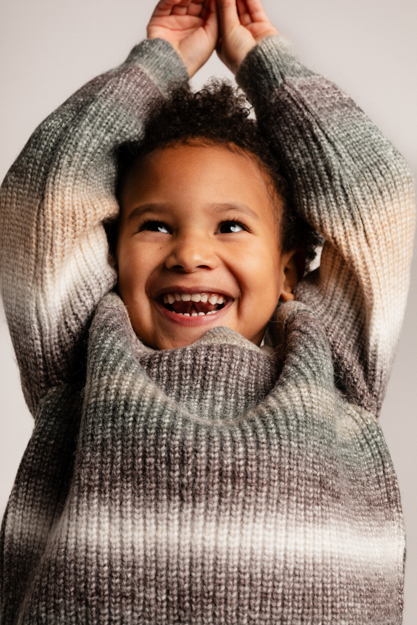 Account aanmakenKindertrui met strepen – groen & grijs melange Deze gestreepte kindertrui is een echte blikvanger in de kindergarderobe. De zachte blend van groen- en grijstinten geeft de trui een stoere en eigentijdse uitstraling. Dankzij de ribgebreide structuur voelt de trui warm en comfortabel aan – perfect voor koude dagen.