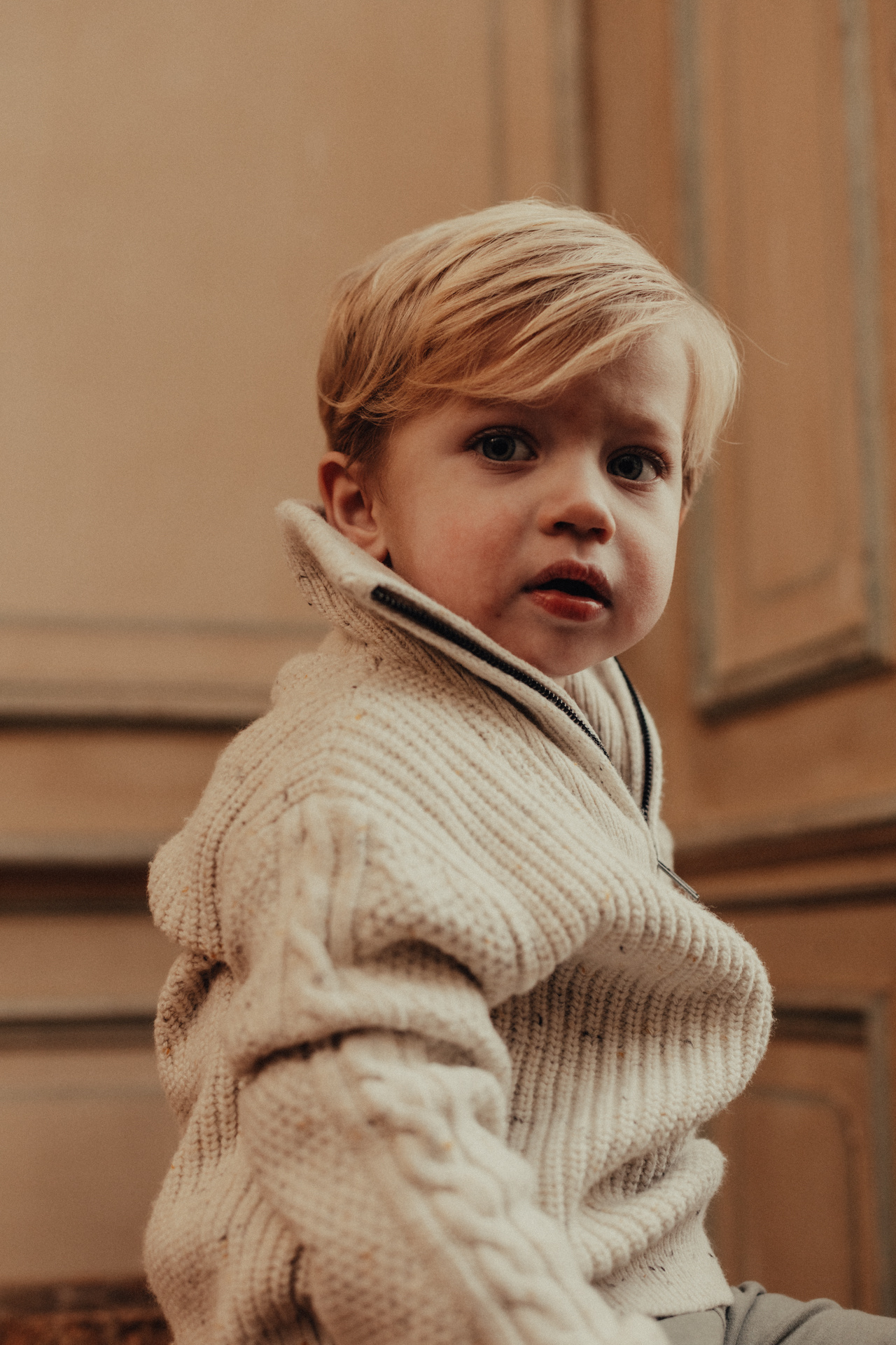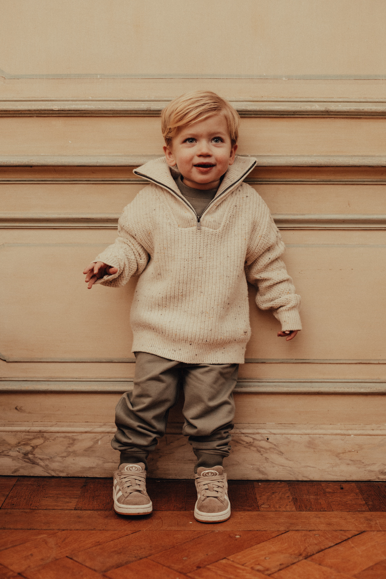 Kindertrui met halve rits – gebreid in zand. Deze warme en stoere gebreide kindertrui met halve rits is een echte winter must-have. Gemaakt van een zachte neppy knit, wat zorgt voor een speelse uitstraling met kleine kleurschakeringen in het garen. De grove structuur, kabeldetails op de mouwen en de halve rits met kraag maken de trui zowel praktisch als stijlvol.