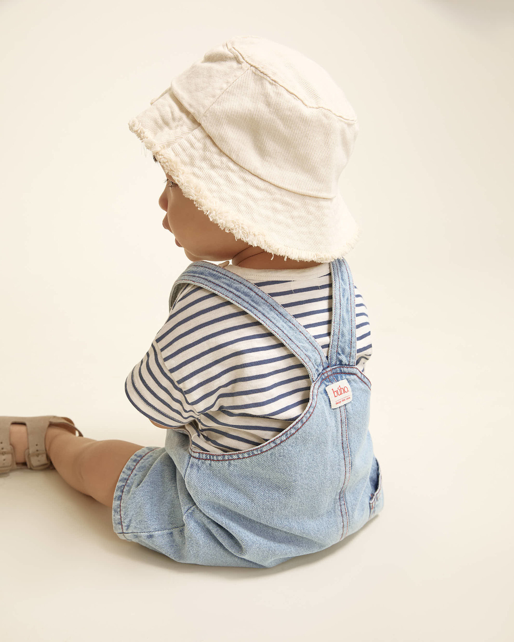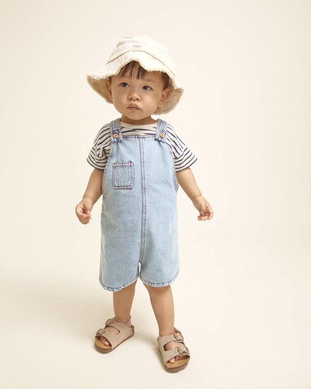 Account aanmakenLight wash denim dungaree. Two-position straps with wooden button at the front and fastened at the back. Plastron-style pocket on the chest. Decorative label and pocket on the back. Press studs at the crotch for easy dressing. Contrast stitching and topstitching details.