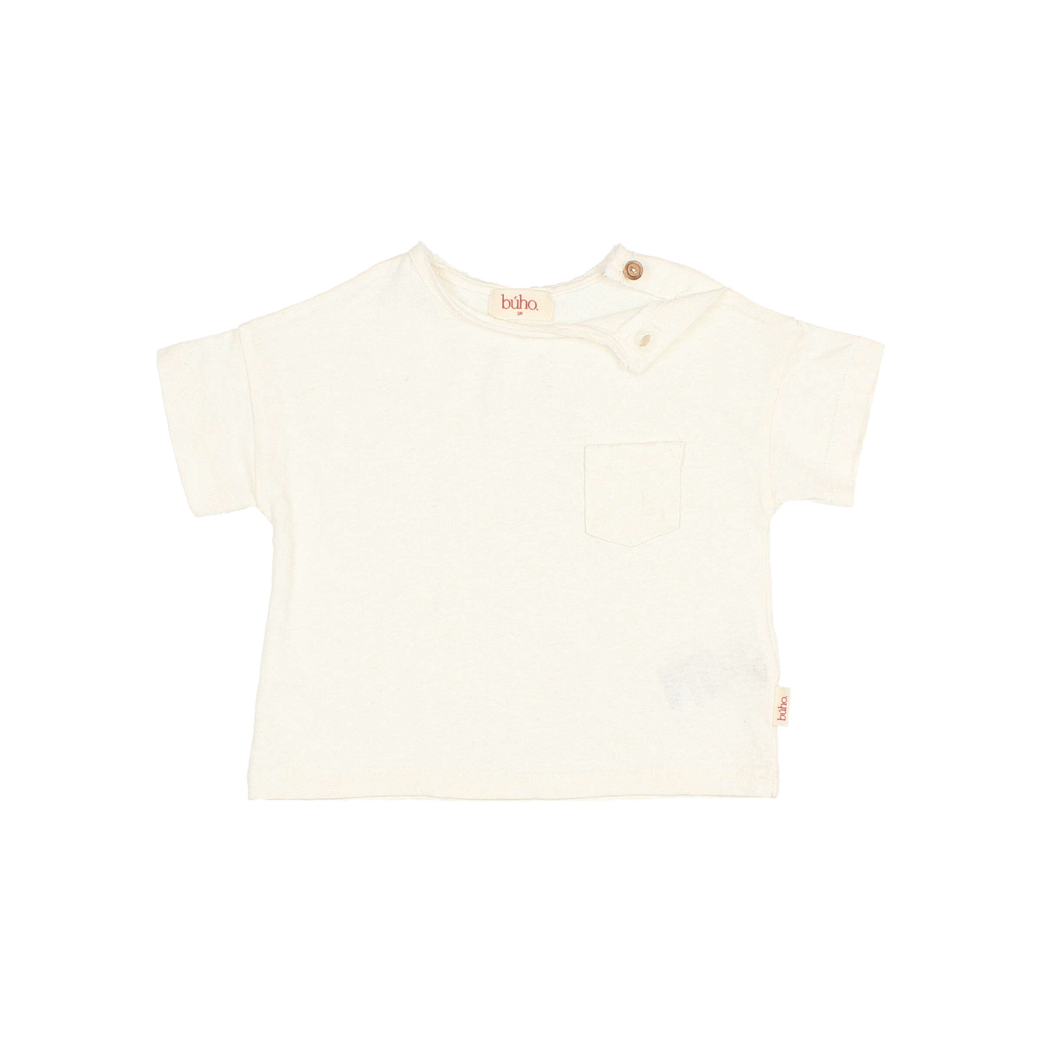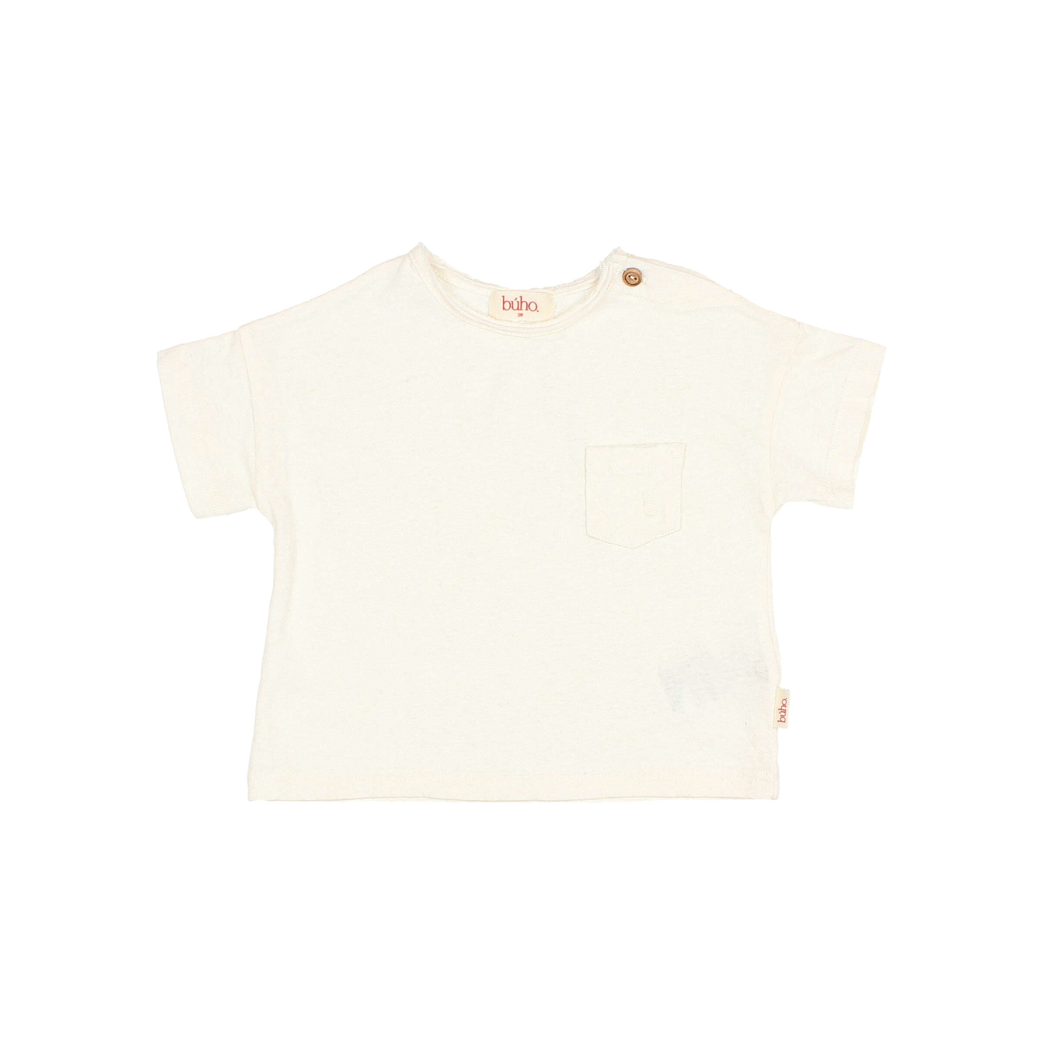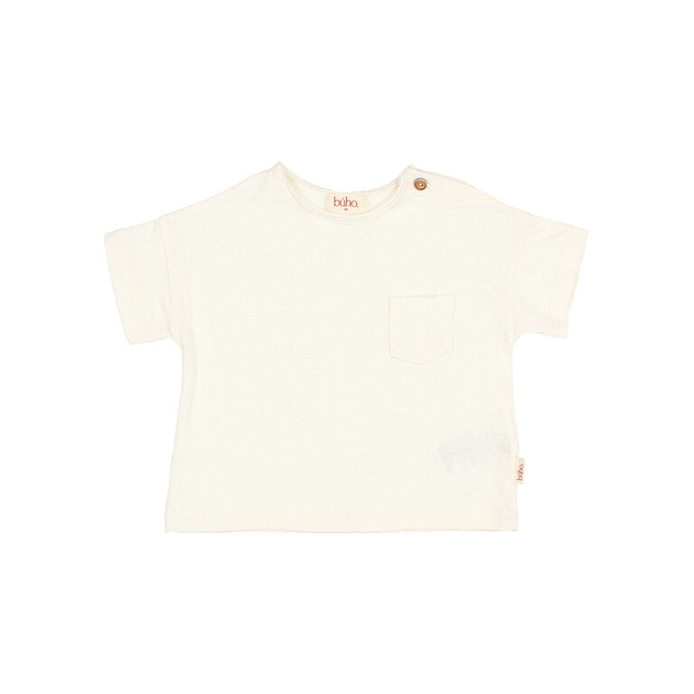 Account aanmakenShort sleeve cotton linen T-shirt. Round neck with wooden button fastening on the shoulder. Decorative pocket on the chest.