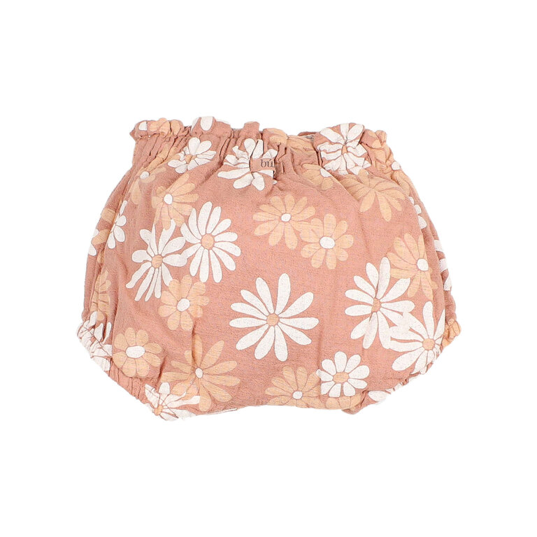 Cotton gauze bloomers with daisy print. Elastic waist and legs. Golden knot in the central part of the back.