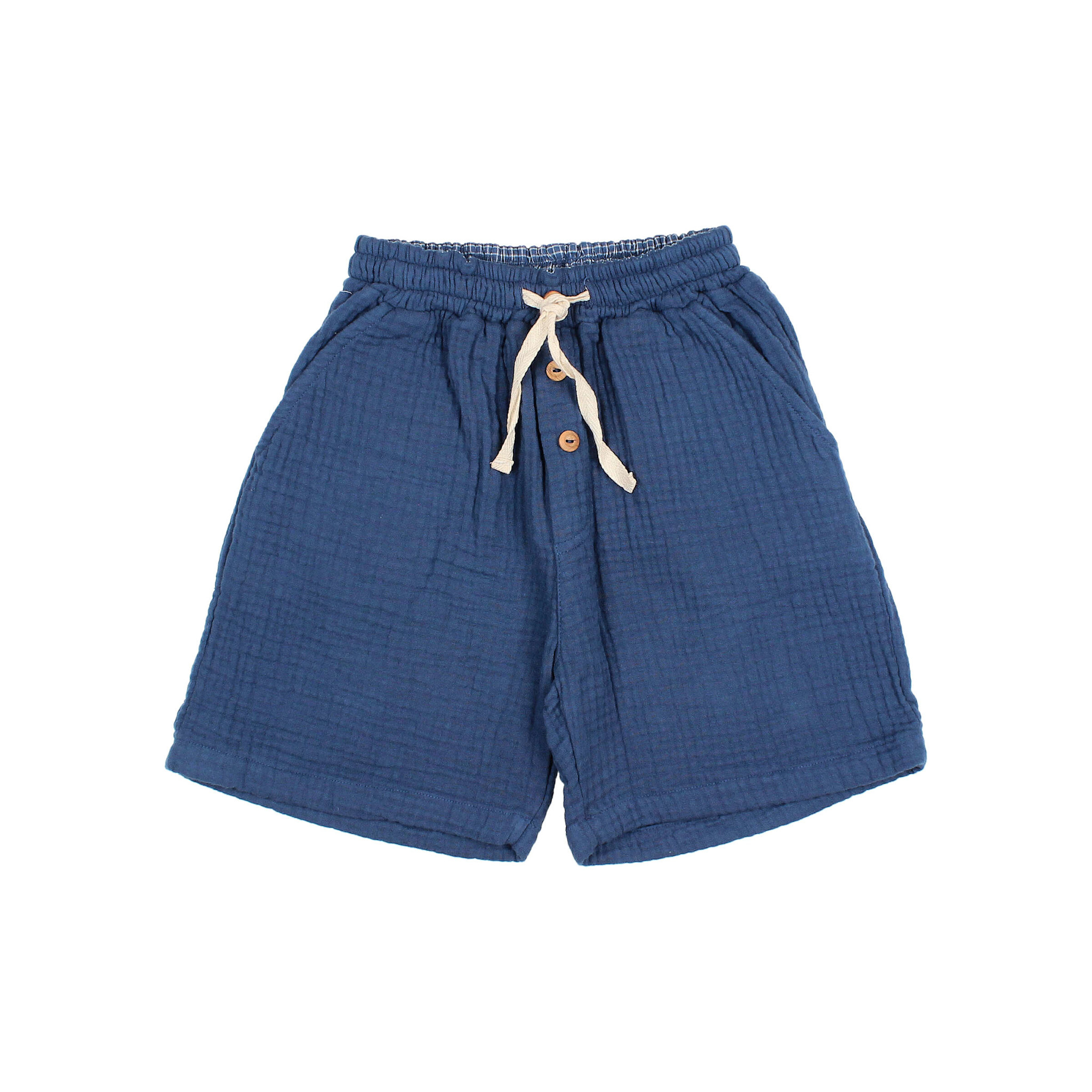 Account aanmakenCotton muslin bermuda. Elastic waistband with raw cotton ribbon for a better fit. Decorative wooden buttons on the front. Front pockets. Plastron-style pocket on the back. Checkered fabric waistband lining.