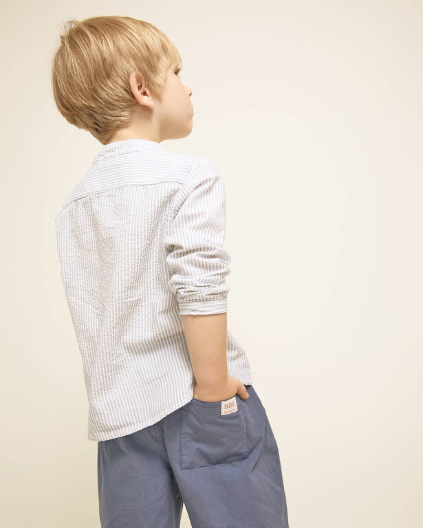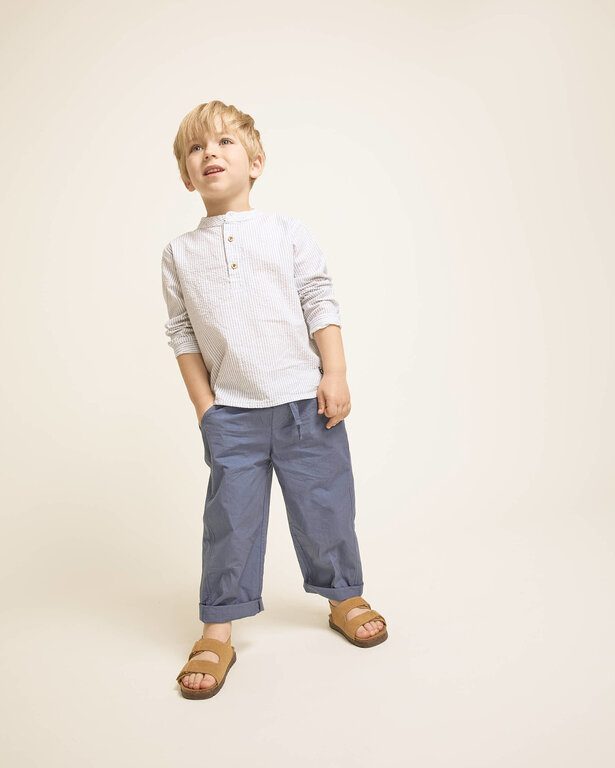 Long poplin pants in organic cotton. Elastic waistband with ribbon for a better fit. Front pockets. Plastron-style pocket on the back with decorative label.
