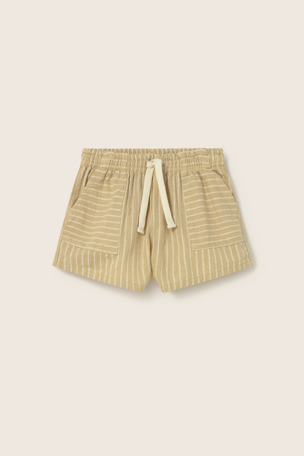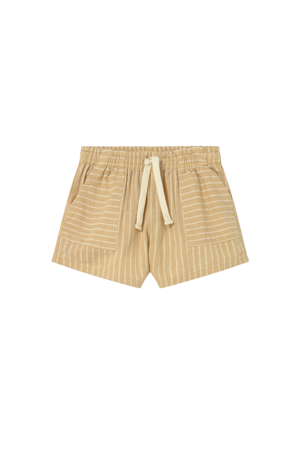 Account aanmakenBaby and toddler boys’ striped shorts made from cotton fabric with a linen-like texture. They feature an elastic waistband with a decorative drawstring and front patch pockets with horizontal stripes for a comfortable, classic look.