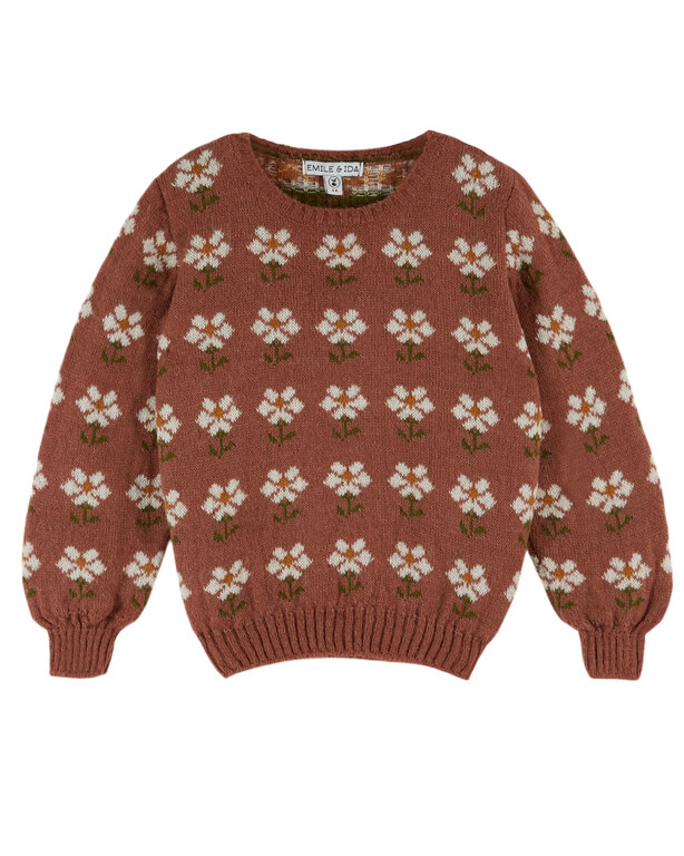 Account aanmakenJacquard sweater in alpaca wool dotted with beautiful white daisies as neatly aligned as in a French garden. This wool is knitted in stockinette stitch in a rather fine yarn.
