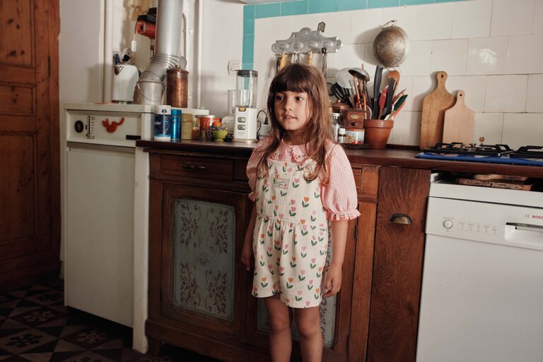 Short overalls in cream cotton canvas printed all-over with pink and orange tulips.