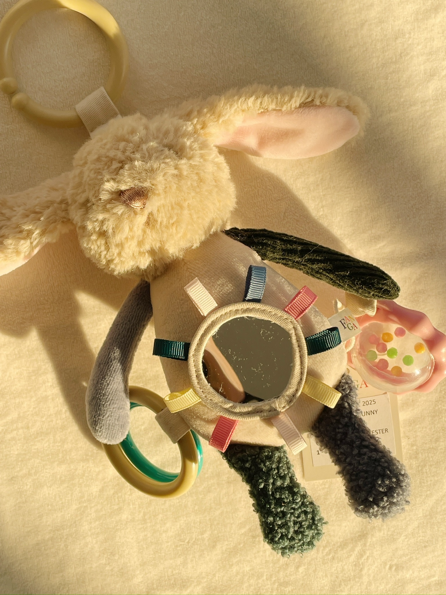 Peluche is designed with different textures that stimulate the senses, a rattle function, a mirror, and easy-grab handles.