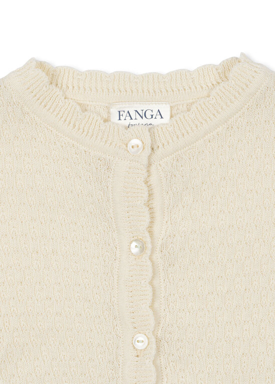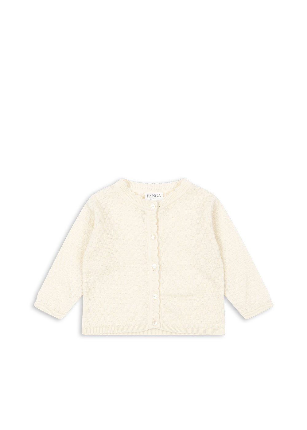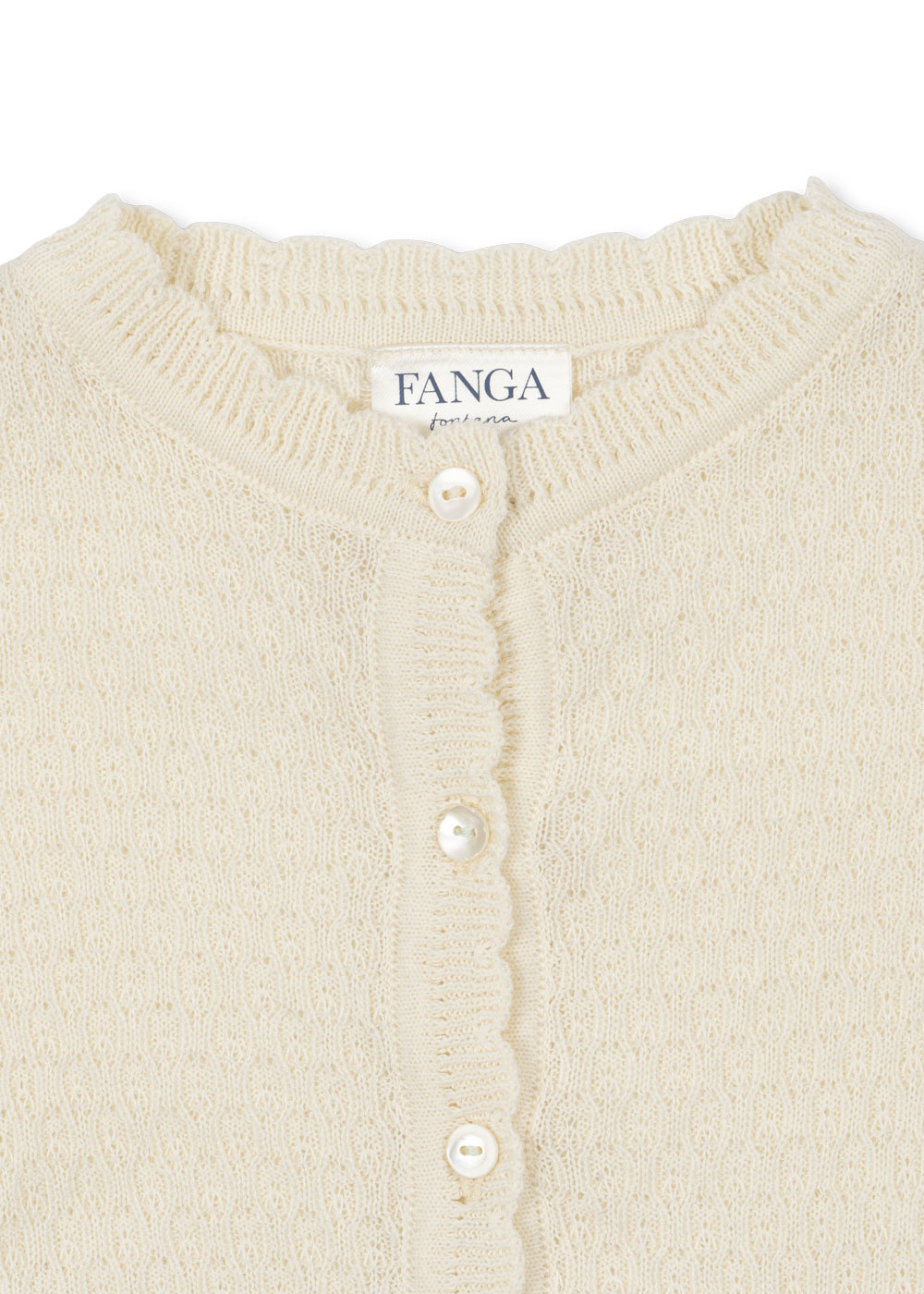 Made from 100% organic cotton that is soft and breathable, and designed with scallop edges and mother of pearl buttons in front.