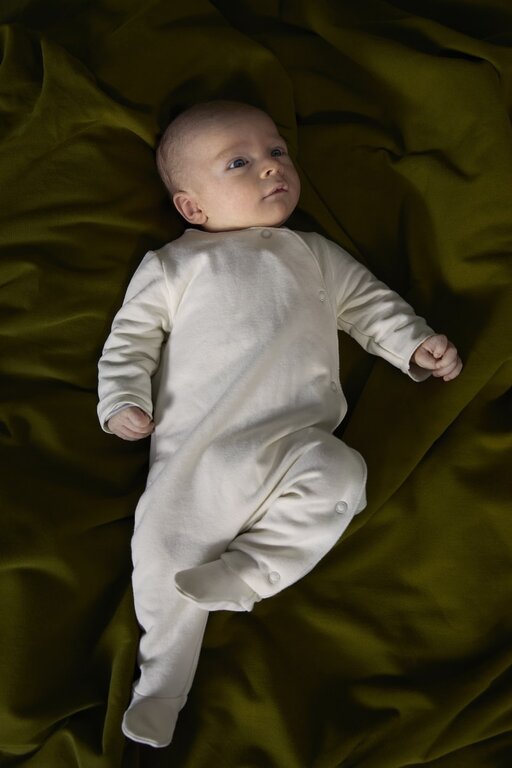 Dit geboortepakje is gemaakt van onze zachte biologische katoenen fleece. Het pakje heeft een ronde hals en drukknopen aan de voorkant. Het heeft voetbedekking en zachte elastische tape aan de binnenkant van de enkel voor bewegingsvrijheid. Ons logo is op de achterkant van het geboortepakje gestikt, net onder de nek.