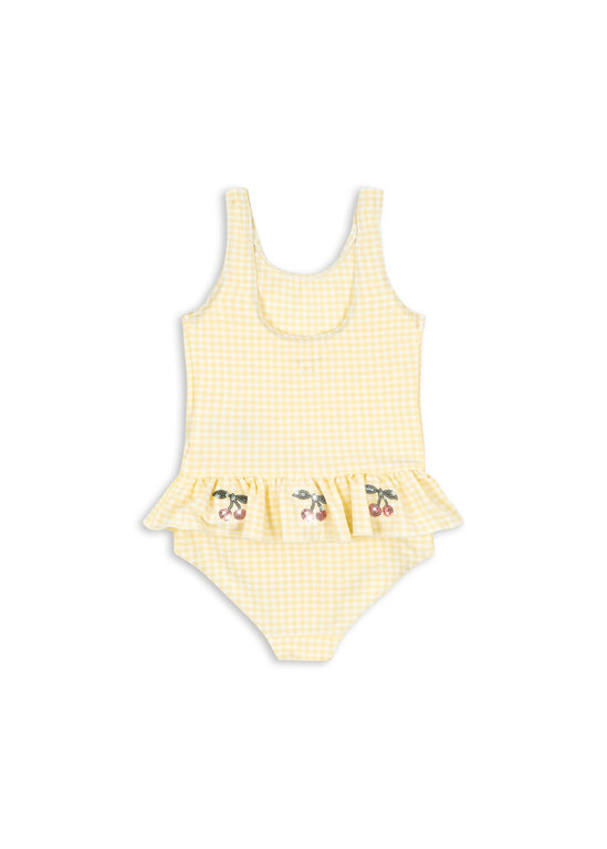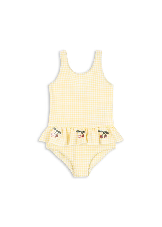 Account aanmakenClassic swimsuit in a textured seersucker fabric with frills and cherry sequin details. Crafted in a quick-drying and flexible fabric that is perfect for long days by the beach or pool.