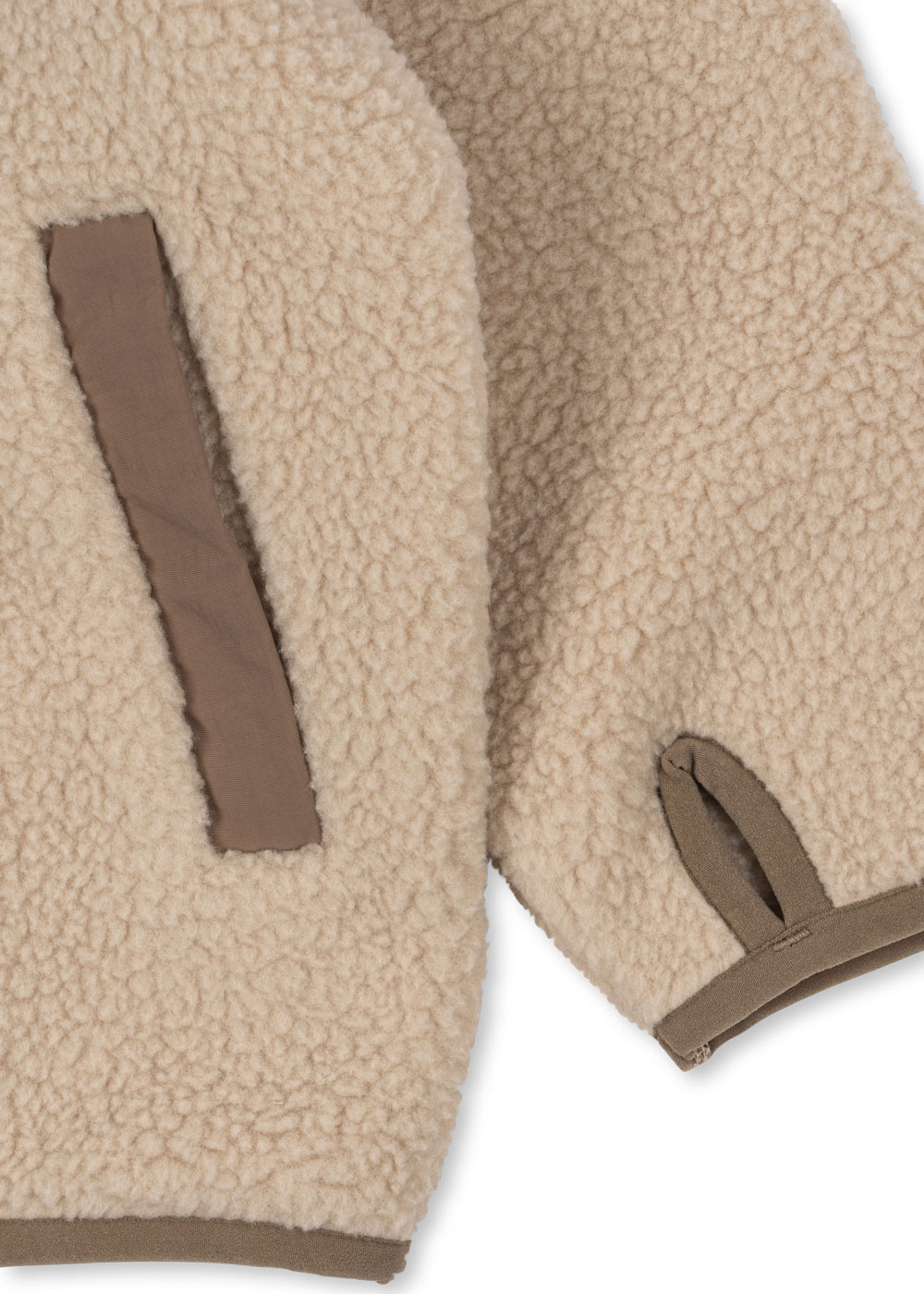 Jacket in a soft fleece quality with a brushed feel. Made from 100% recycled polyester. Designed with a high collar, practical pockets lined with organic cotton, and thumb holes at sleeve end.
