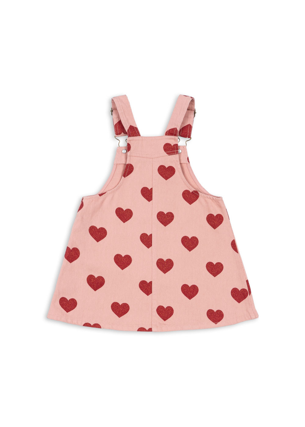 Spencer dress in a soft denim fabric with classic buckle and strap closure. Designed with an all-over glitter heart print.