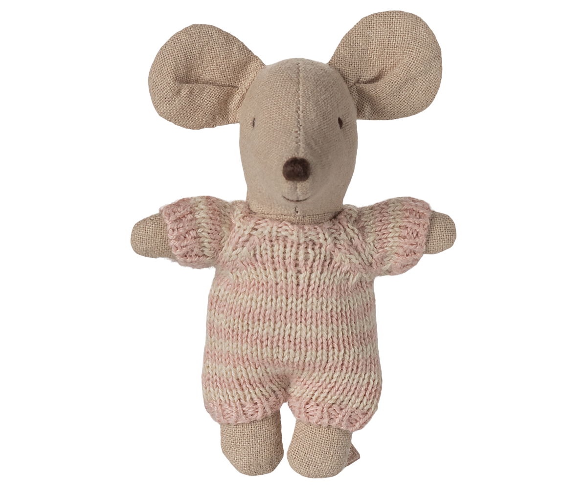 Account aanmakenA small baby mouse in a soft and striped knitted suit. It sleeps for hours in its little quilted carry cot.