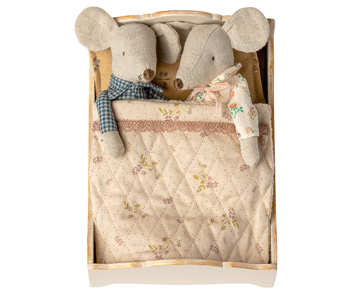 Account aanmakenThe perfect bed for a good nights sleep. This bed has beautiful small details such as golden finish on the wood and beautiful collected fabrics for bedlinen. Two mice can easily sleep side by side as it fits big sister/brother mice.