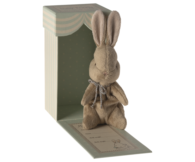 My first bunny is perfect for small hands. It is made in a soft plush quality and has a colored ribbon around the neck. It comes in a beautiful gift box, inside you can add the birth information.