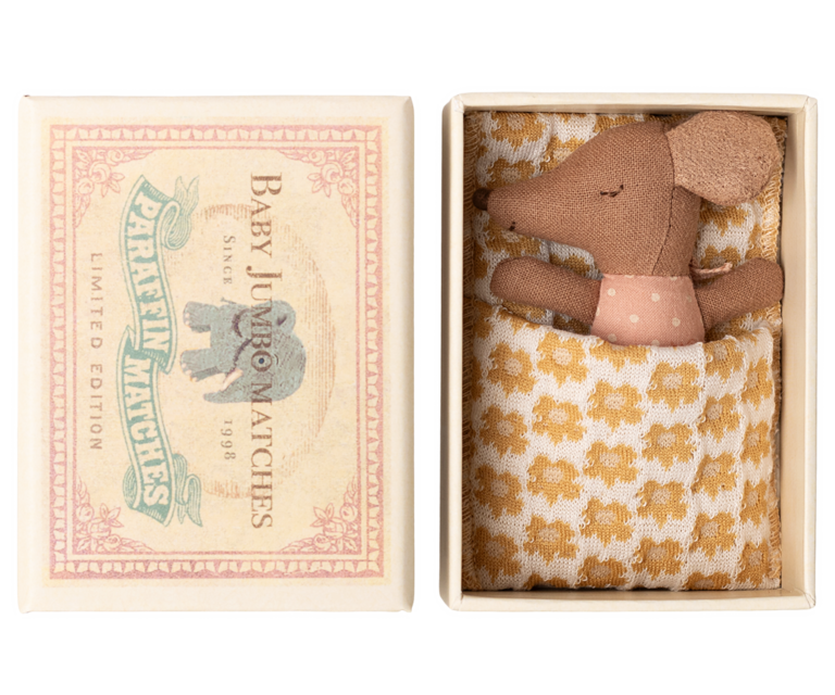 A classic Maileg item. This mouse is ready for hours of play and sleeps tight in the little matchbox. The clothes and bedlinen are made of soft fabrics with unique prints in beautiful colors.
