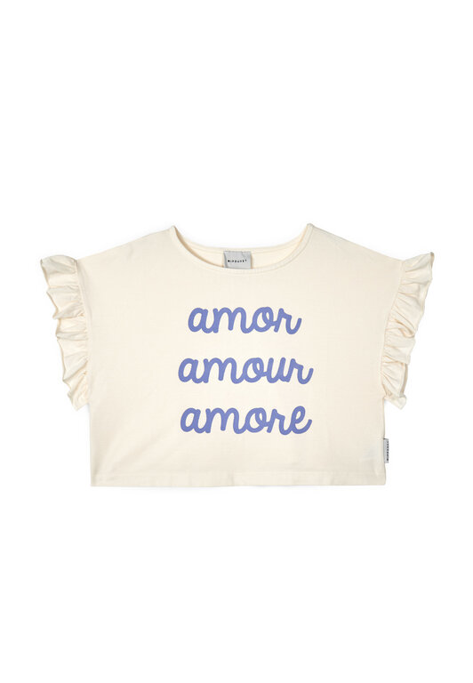 Account aanmakenAll you need is love. This cropped T-shirt is defined by an 'Amor Amour Amore' cursive print and fluid ruffles across the shoulders. - Crewneck - Dropped shoulder - Cropped length - Frill trim - 'Amor Amour Amore' print - MIPOUNET logo label