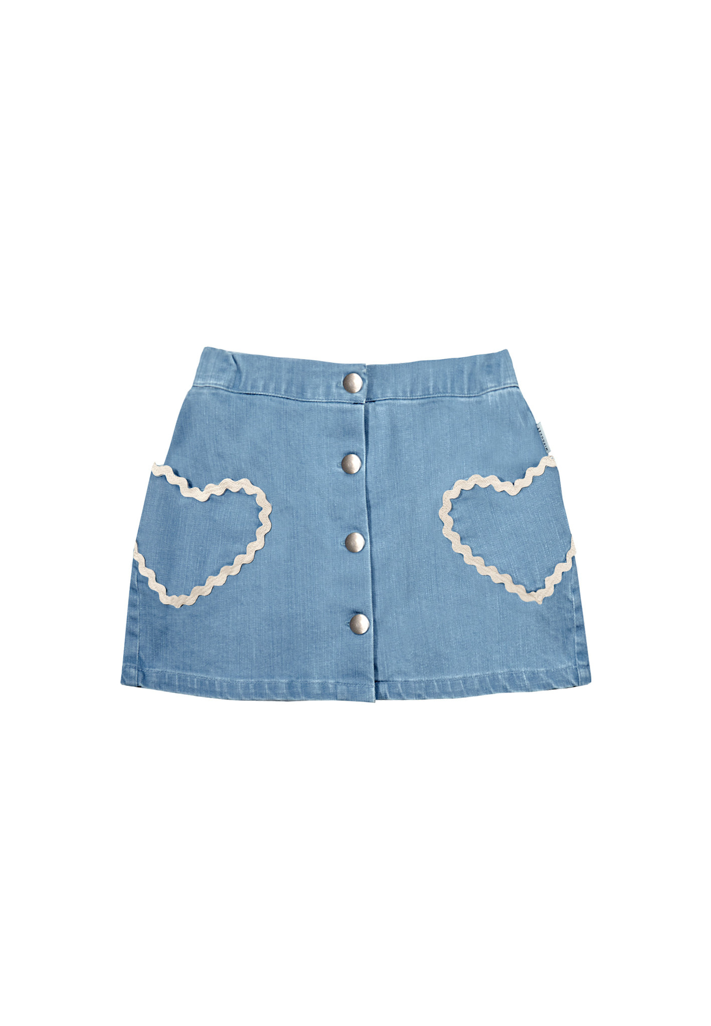 Account aanmakenDouble down on denim with this cute skirt. The close-fitting silhouette features a central button opening and two heart-shaped pockets for a girly look. - Elastic waist - Two heart-shaped pockets - Wavy ribbon trim - Button closure.