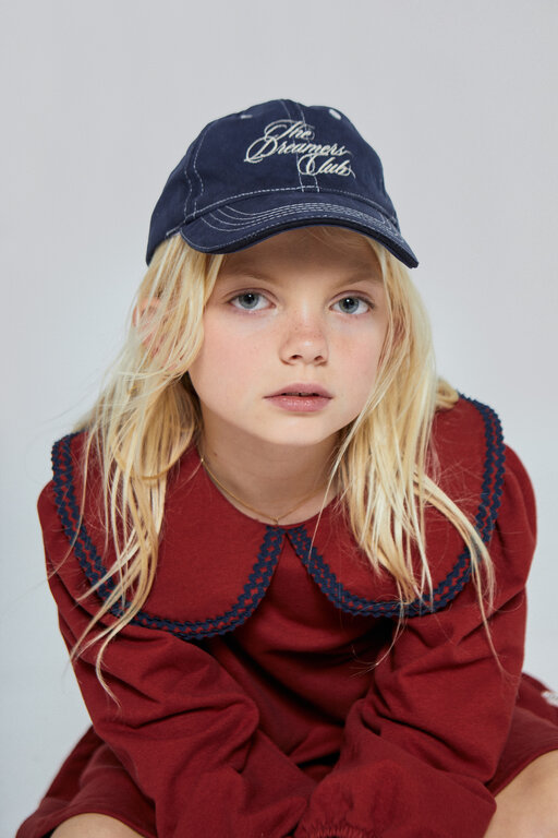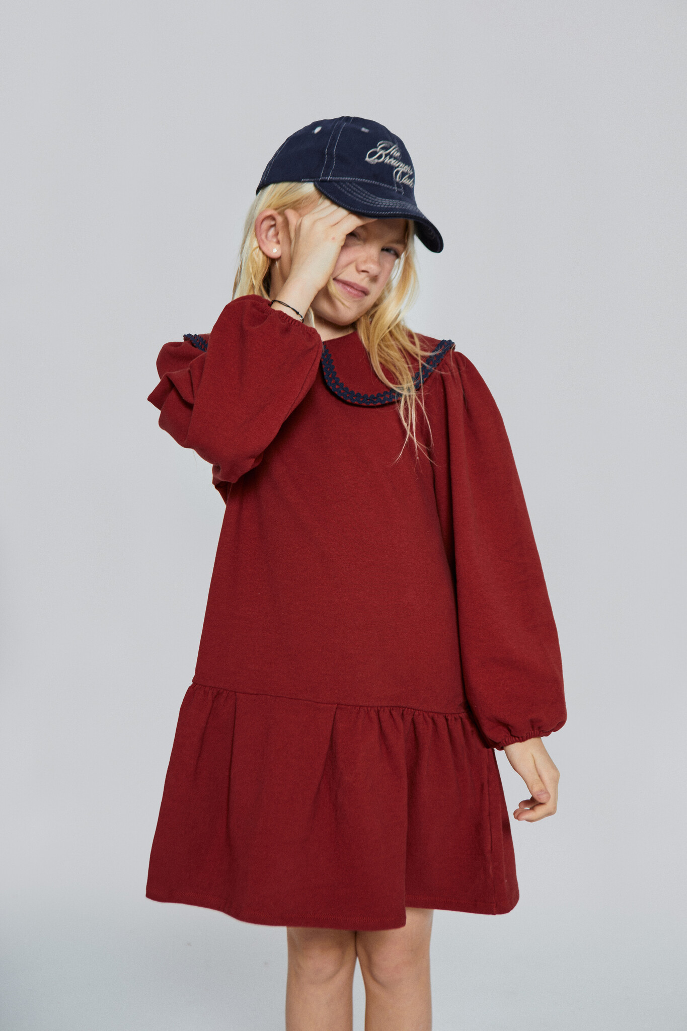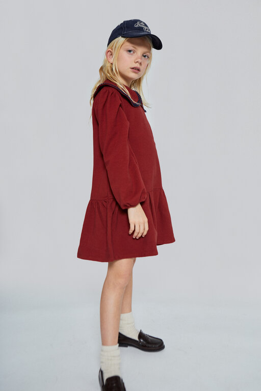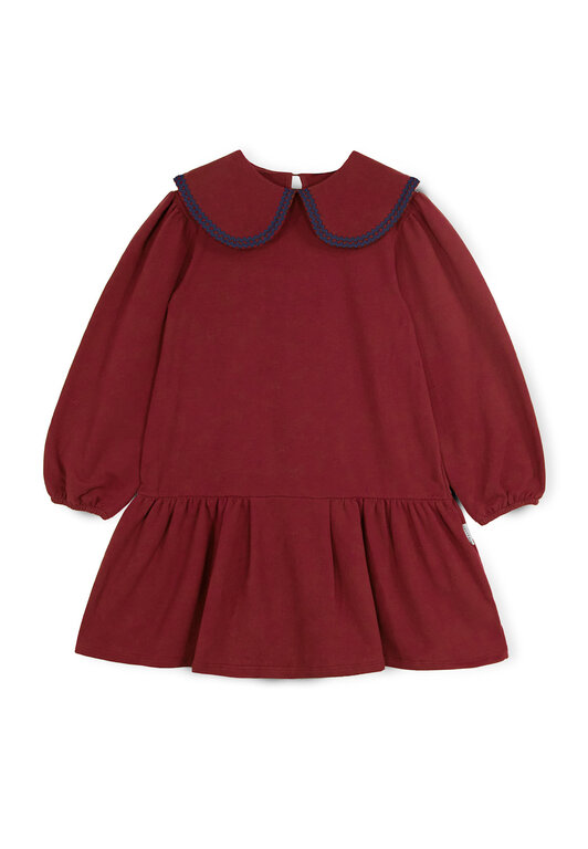 Presented in an easy-to-wear jersey, this graceful dress is the answer to transitional dressing. The laid-back silhouette is defined by a Peter Pan collar and a contrasting ribbon trim.