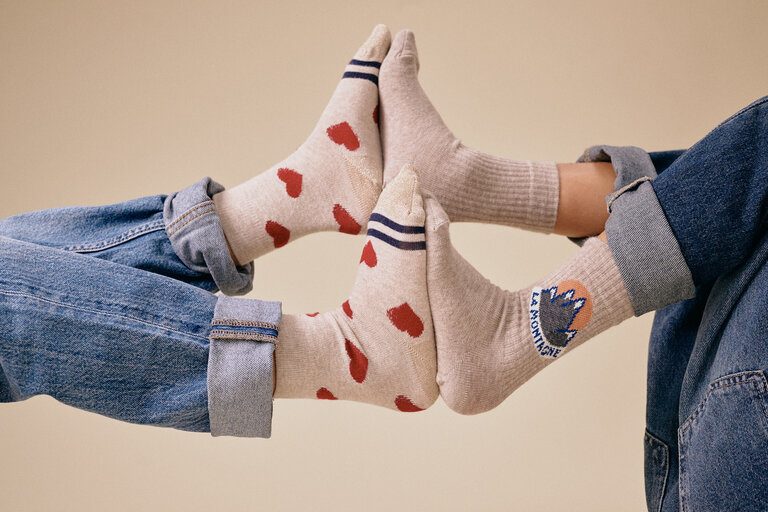 Cotton socks from MPkids. The socks have a wide elasticated hem with a cool motif of a mountain shading the sun and a banner with the text "La Montagne". They have an anatomically correct heel and reinforced heel and toe.