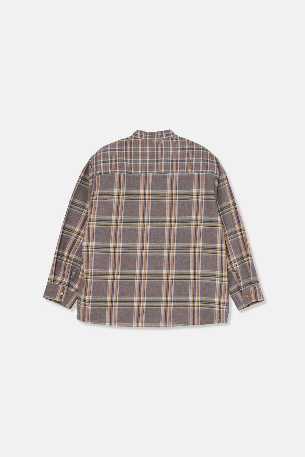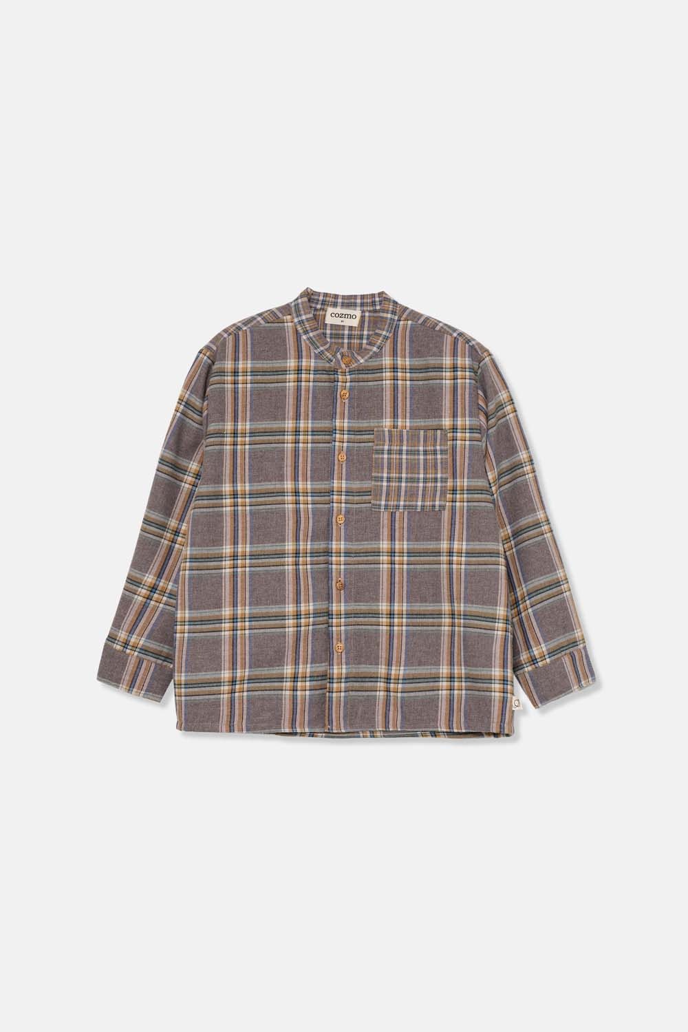 Mao collar and buttons at front. Chest patch pocket. Long sleeves and cuffs with buttons. Yoke at back.