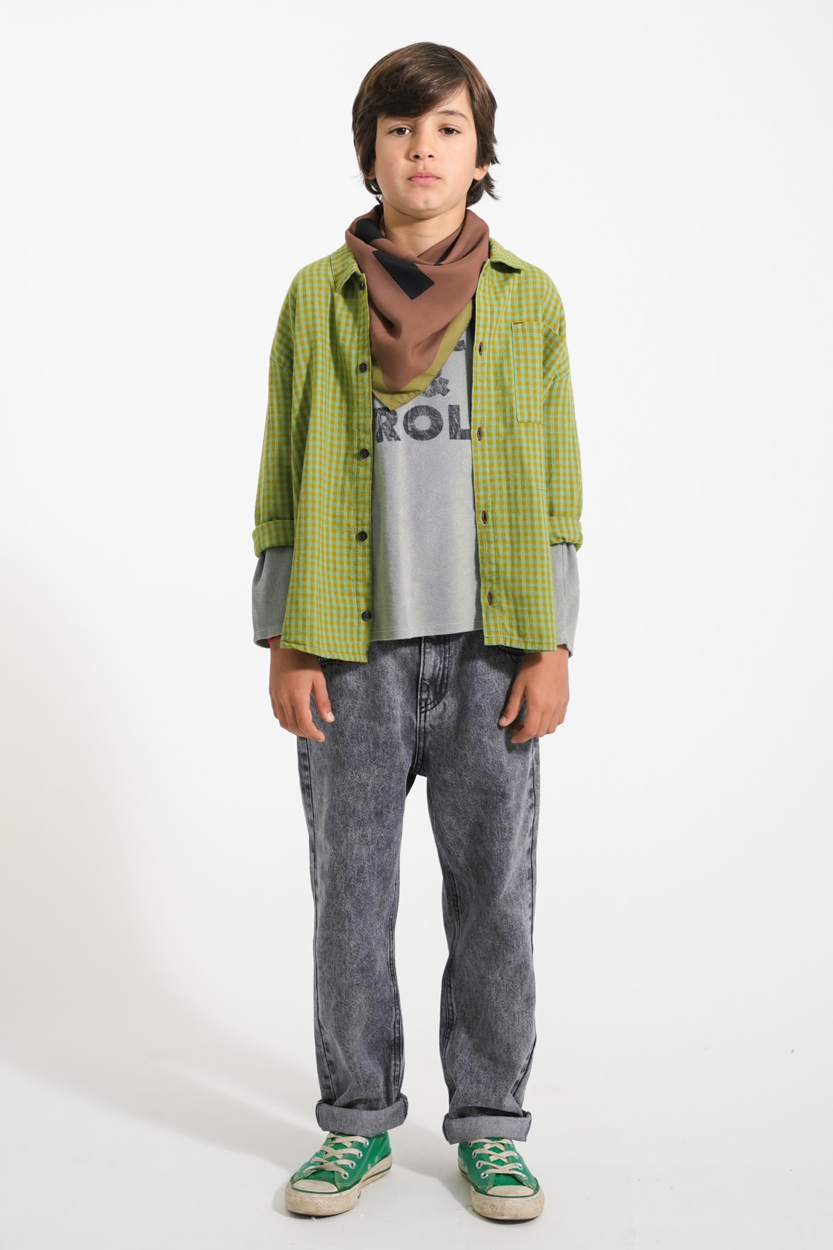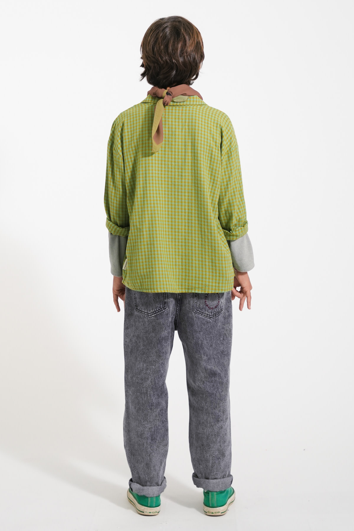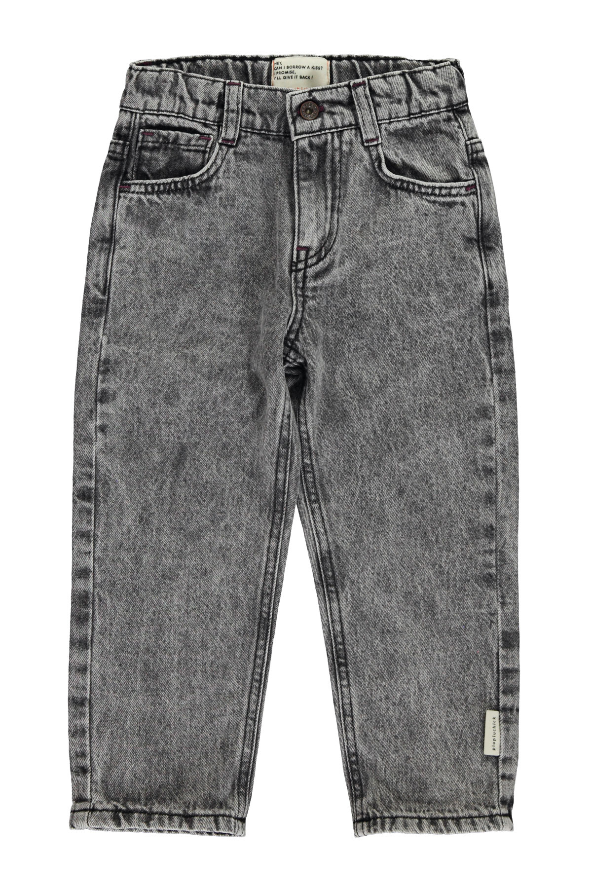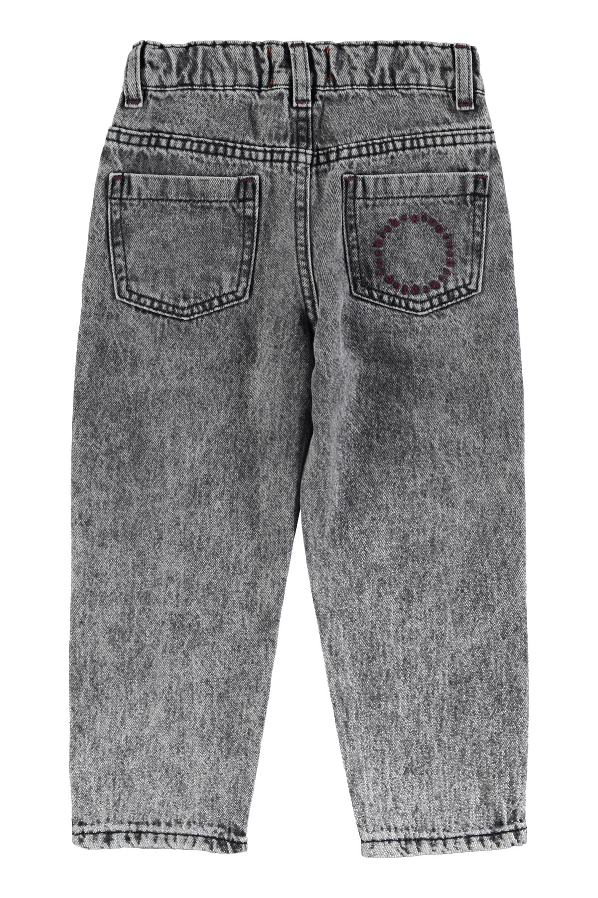Unisex denim trousers with adjustable waist. Detailed with bordeaux logo embroidery  in one back pocket.