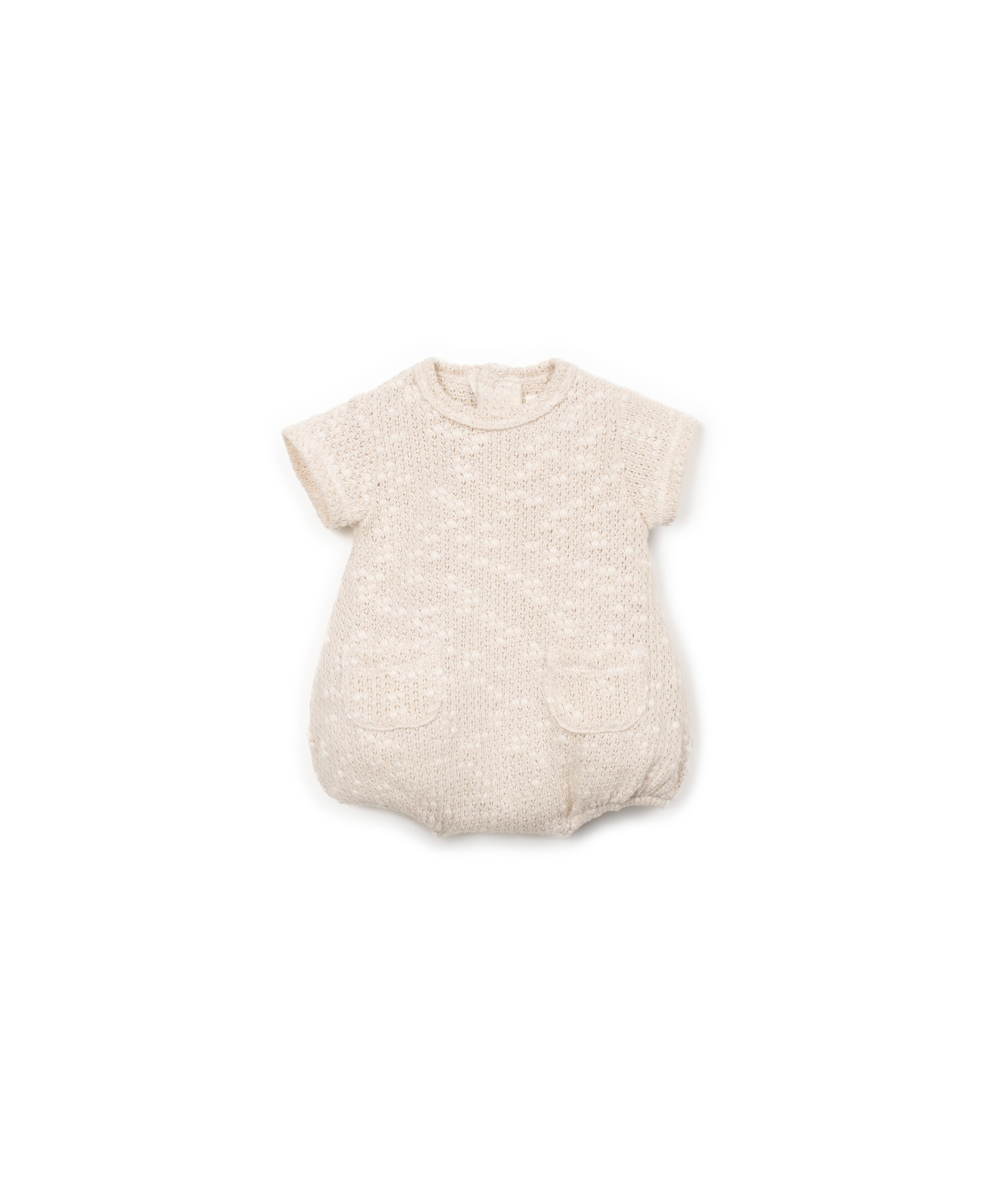 This jumpsuit is made from jersey with a blend of cotton and recycled cotton, in the Cru colour. It includes the Re(Play) yarn derived from recycling our post-industrial waste. It is a short-sleeved model with a round neckline and a balloon shape. It features a back opening with coconut buttons and a nickel-free metal snap-button opening between the legs.