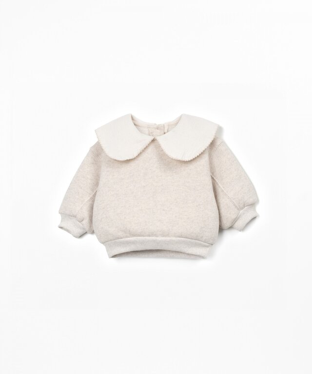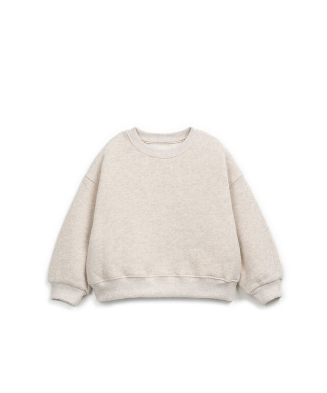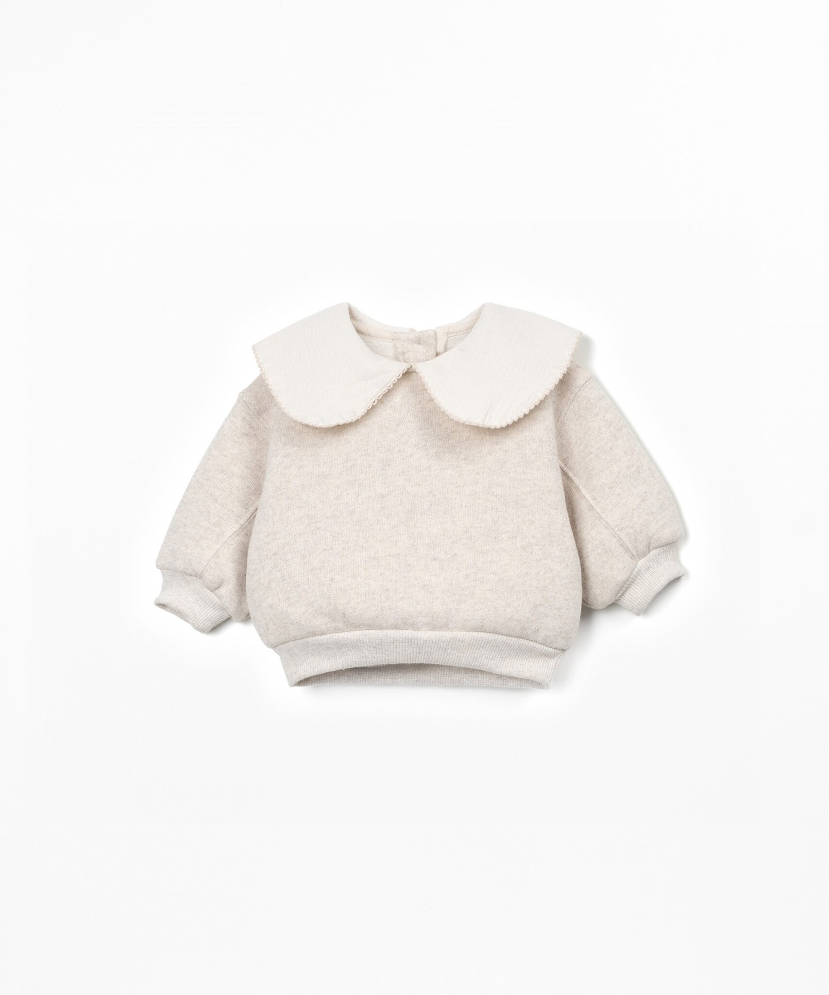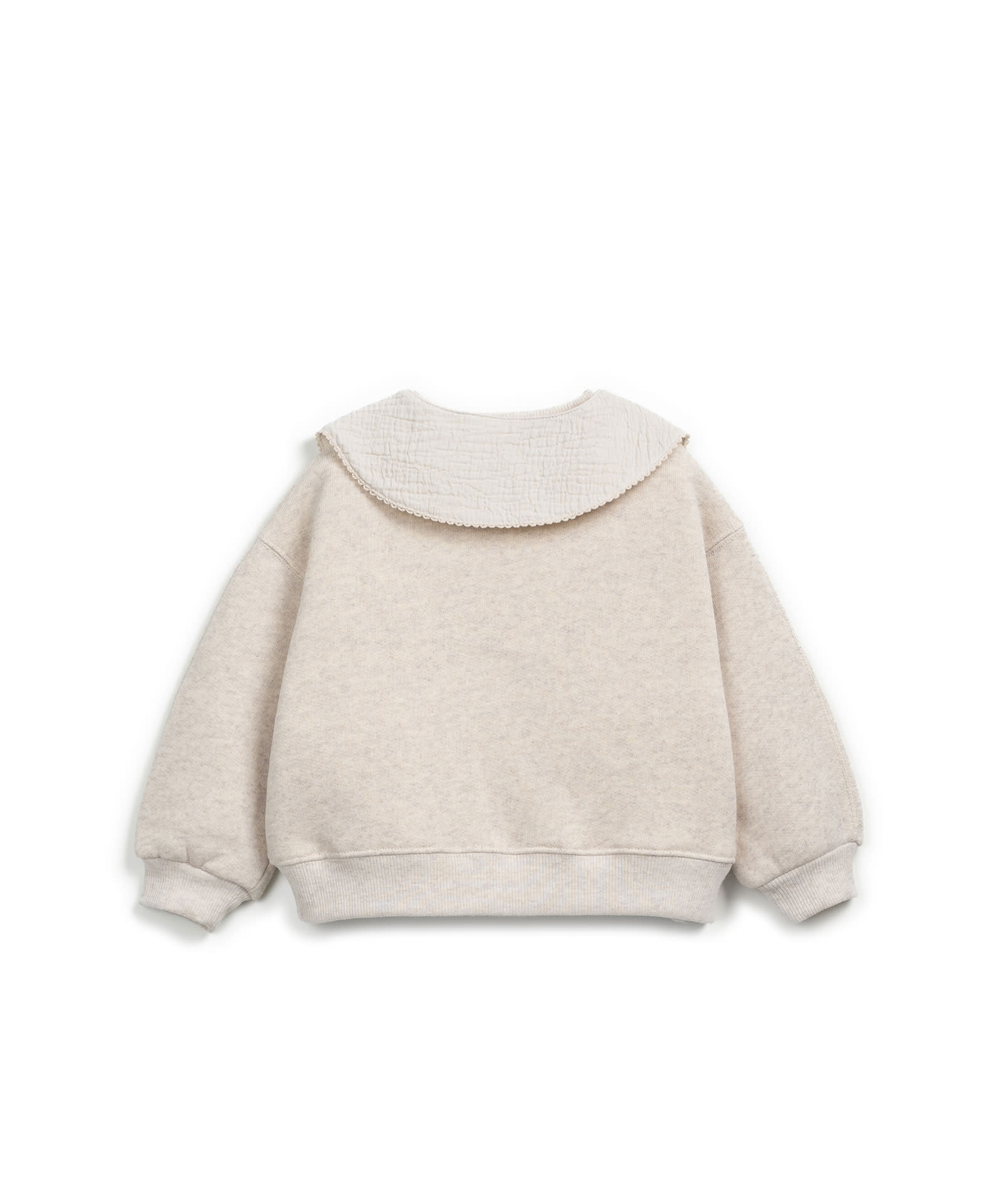 Account aanmakenThis fleece sweatshirt is made of knit fabric with a blend of cotton, recycled cotton, and recycled polyester, in Natural color. It features long sleeves, a large collar, and an opening at the back with a coconut button.