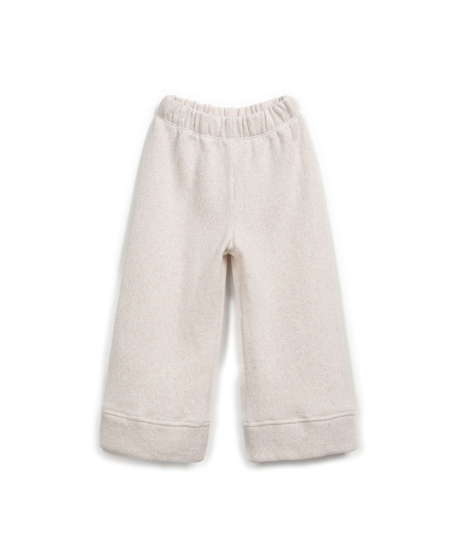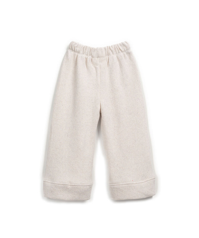 These trousers are made of jersey with a blend of regenerative cotton and recycled cotton, in the Off-White color. They have a wide-leg design and an elastic waistband.
