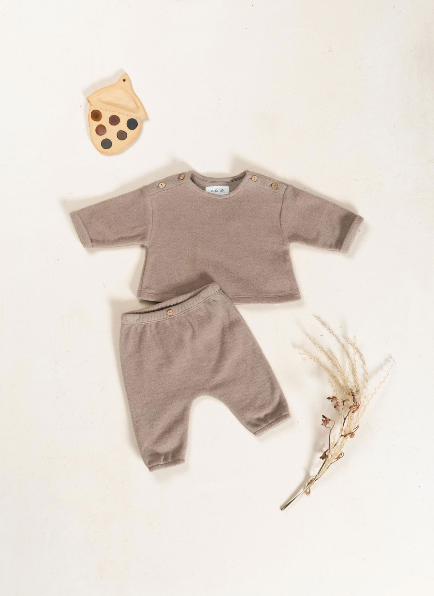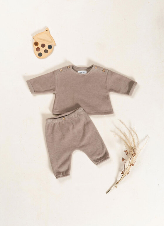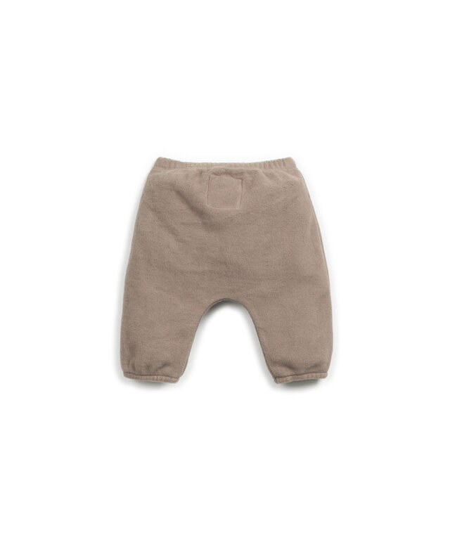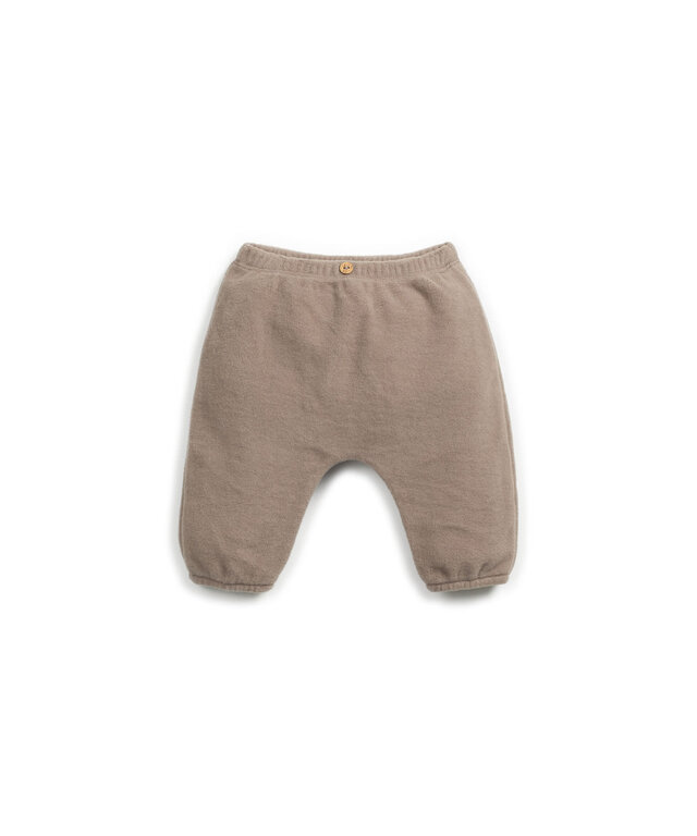 Account aanmakenThese fleece trousers are made from organic cotton, in Light Brown color. This model features an elastic waistband and a decorative coconut button, with elastic applied at the cuffs.