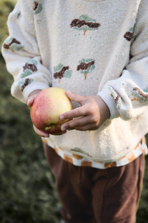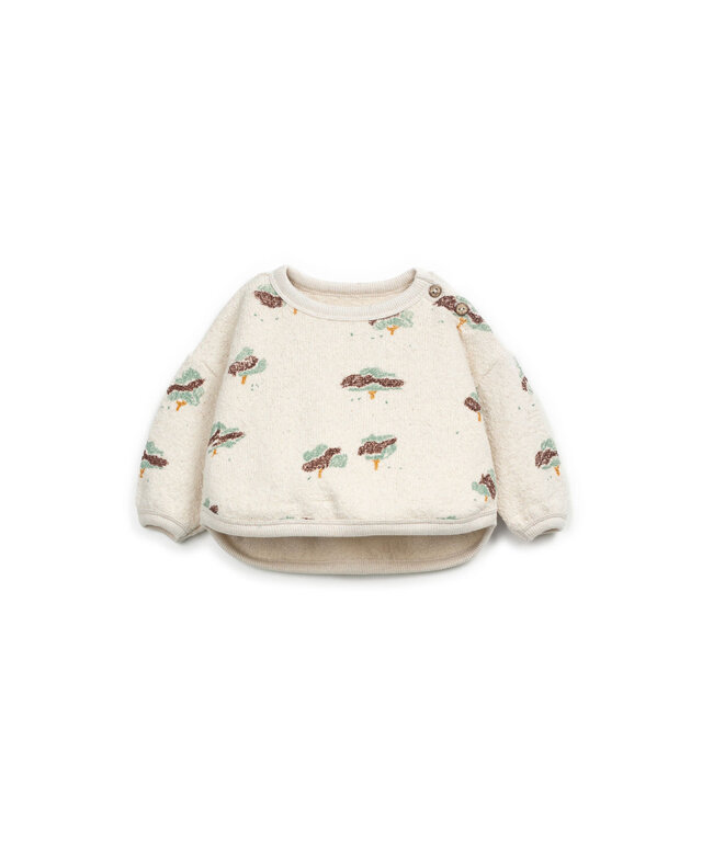 This sweater is made in knit fabric with a blend of organic cotton and regenerative cotton, in Off White color. It features long sleeves, a round neckline, shoulder opening with coconut buttons and our tree print.