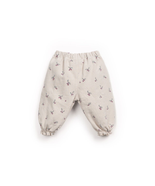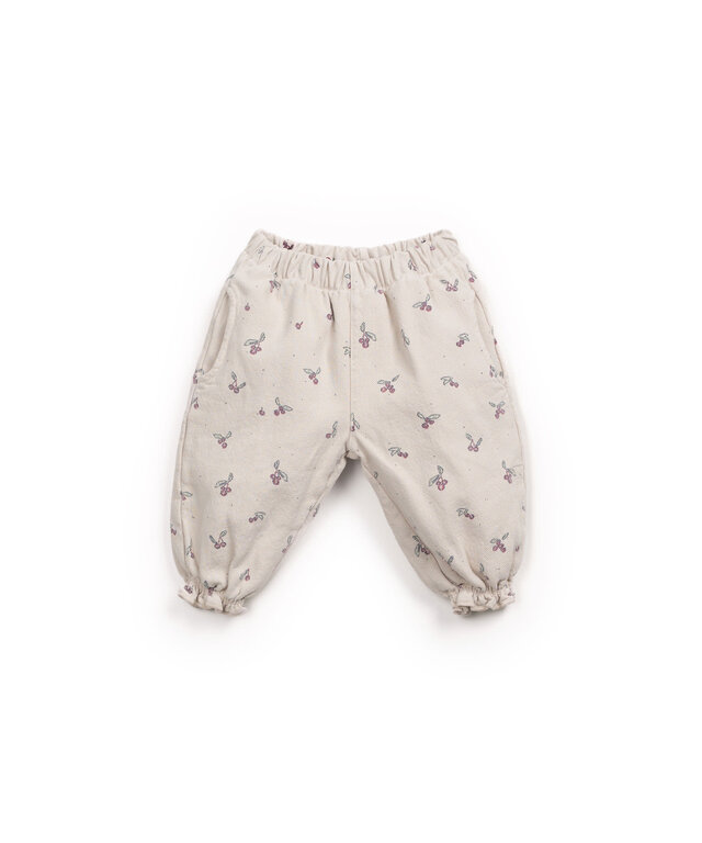 These trousers are made of cotton twill in the color Raw. It is a model with an elastic waistband, pockets, and our strawberry tree print.
