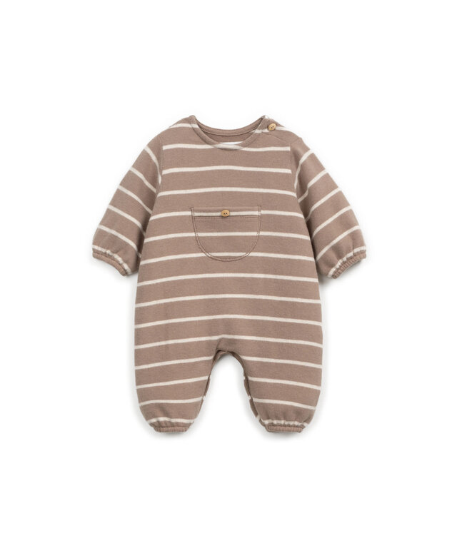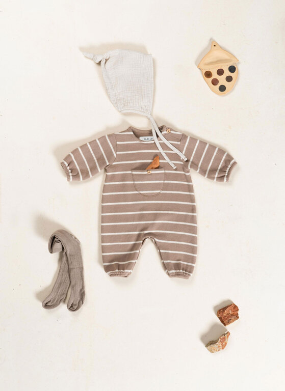 This jumpsuit is made of jersey fabric with a blend of regenerative cotton and recycled cotton, in Off White color. It is a long model with light brushing on the inside, shoulder opening with wooden button, snap fasteners between the legs made of nickel-free metal, elastic on the leg and arm openings, and a front pocket.