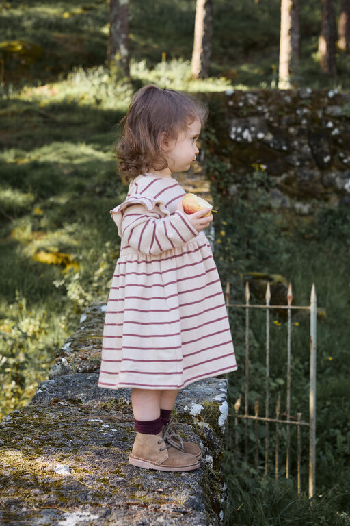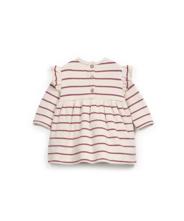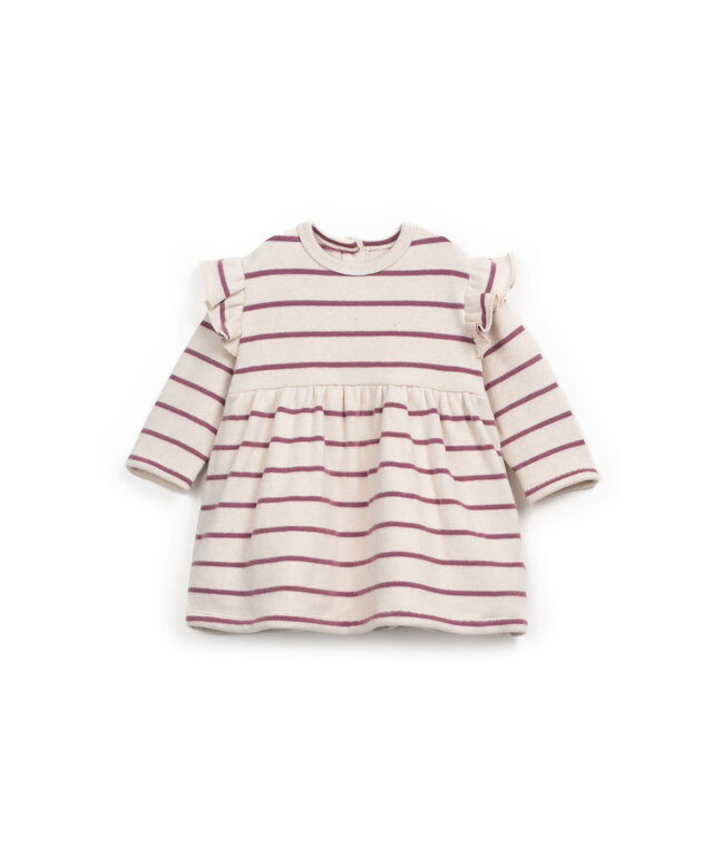 Account aanmakenThis dress is made of jersey fabric with a mixture of regenerative cotton and recycled cotton, in Dark Pink color. It is a model with long sleeves and shoulder ruffle, round neckline, gathered at the waist, back opening with coconut button, and striped pattern.