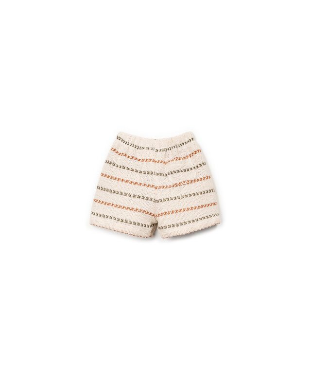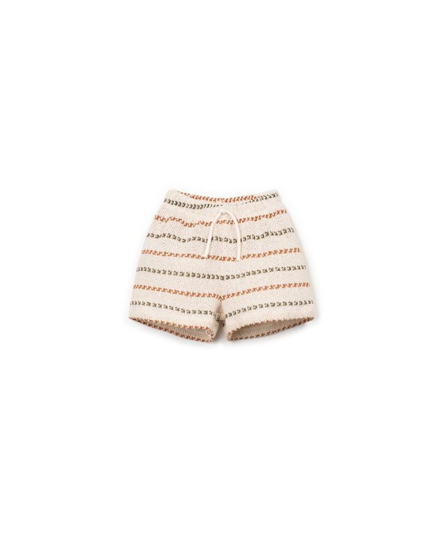 These shorts are made of knit fabric with a blend of cotton and recycled cotton. They feature an elastic waistband, a decorative drawstring, and our striped pattern.
