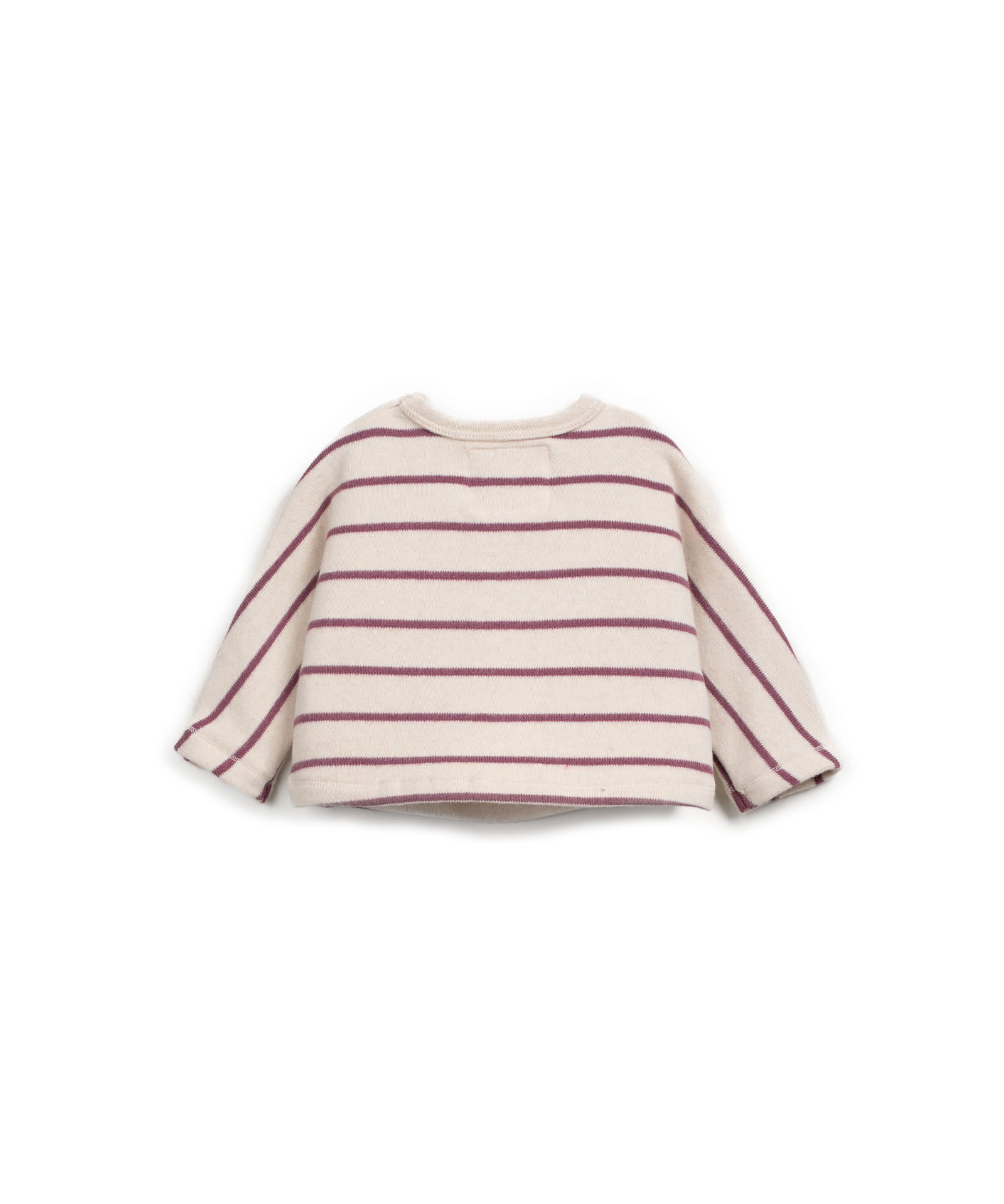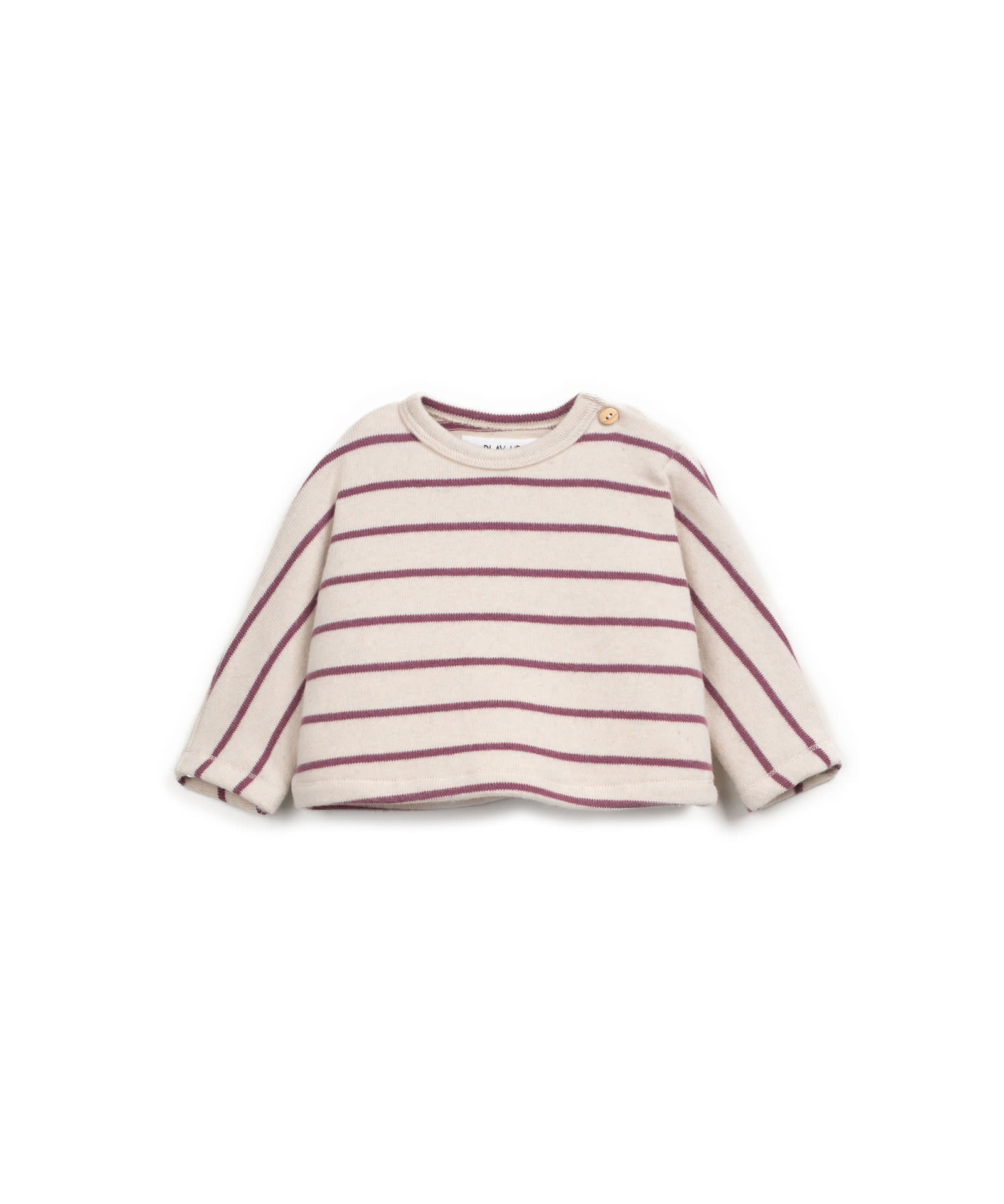 This sweater is made of knit fabric with a blend of regenerative cotton and recycled cotton, in Dark Pink color. It is a long-sleeved model, with brushed interior, round neckline, coconut button opening on the shoulder, and our striped pattern.
