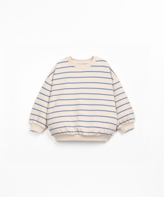 This sweater is made from a knit fabric combining regenerative cotton and recycled cotton, in Blue color. It features long sleeves, a crew neck, elasticated cuffs and waistband, and a striped pattern.