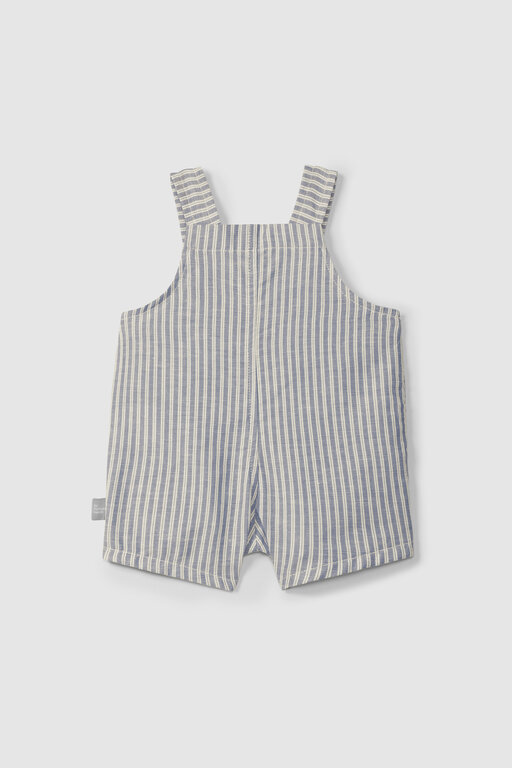 Account aanmakenDungaree shorts in organic cotton striped fabric with a touch of linen. Functional pocket detail on the front. Fasten with wooden buttons on the straps in two positions and poppers between the legs up to 12 months.