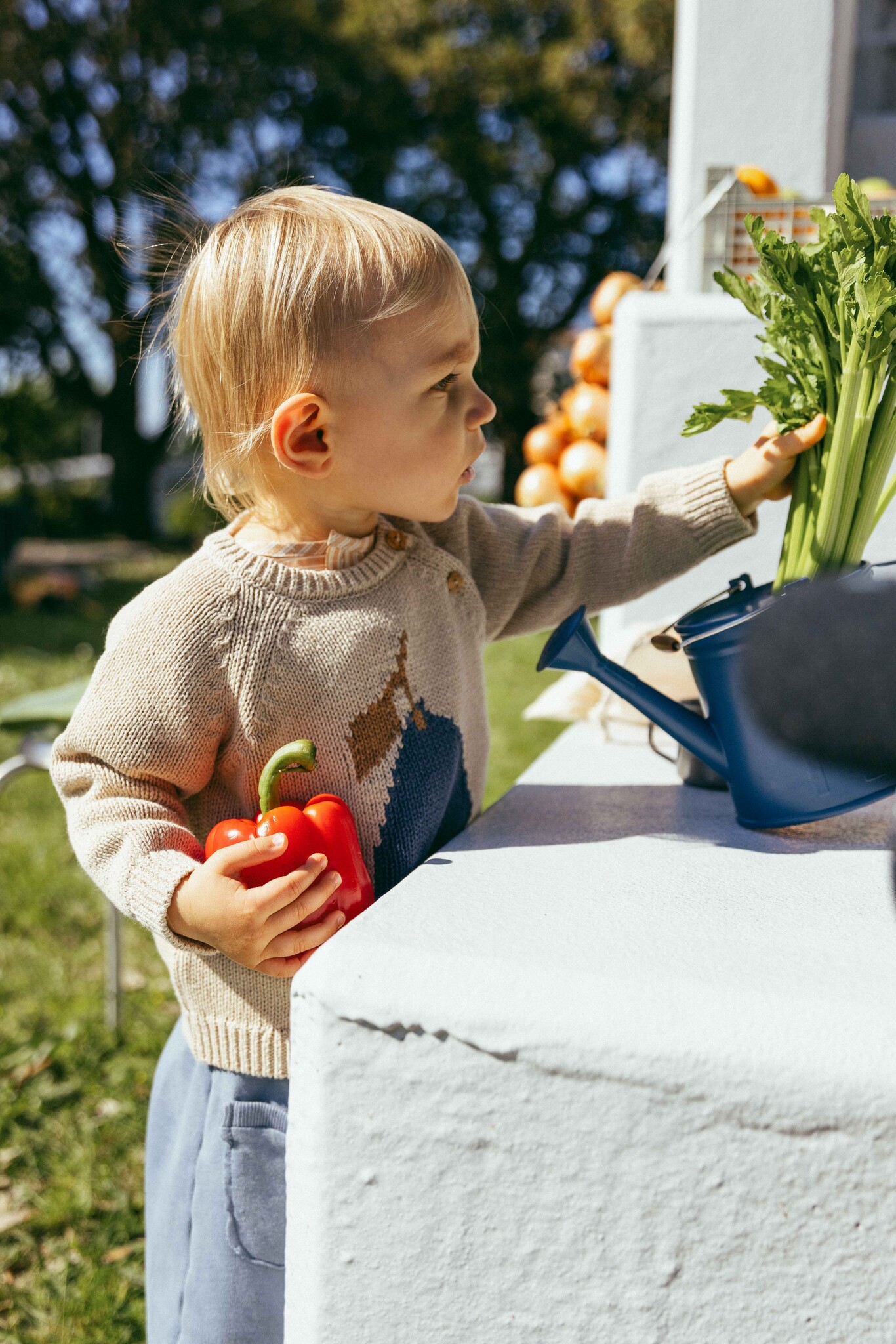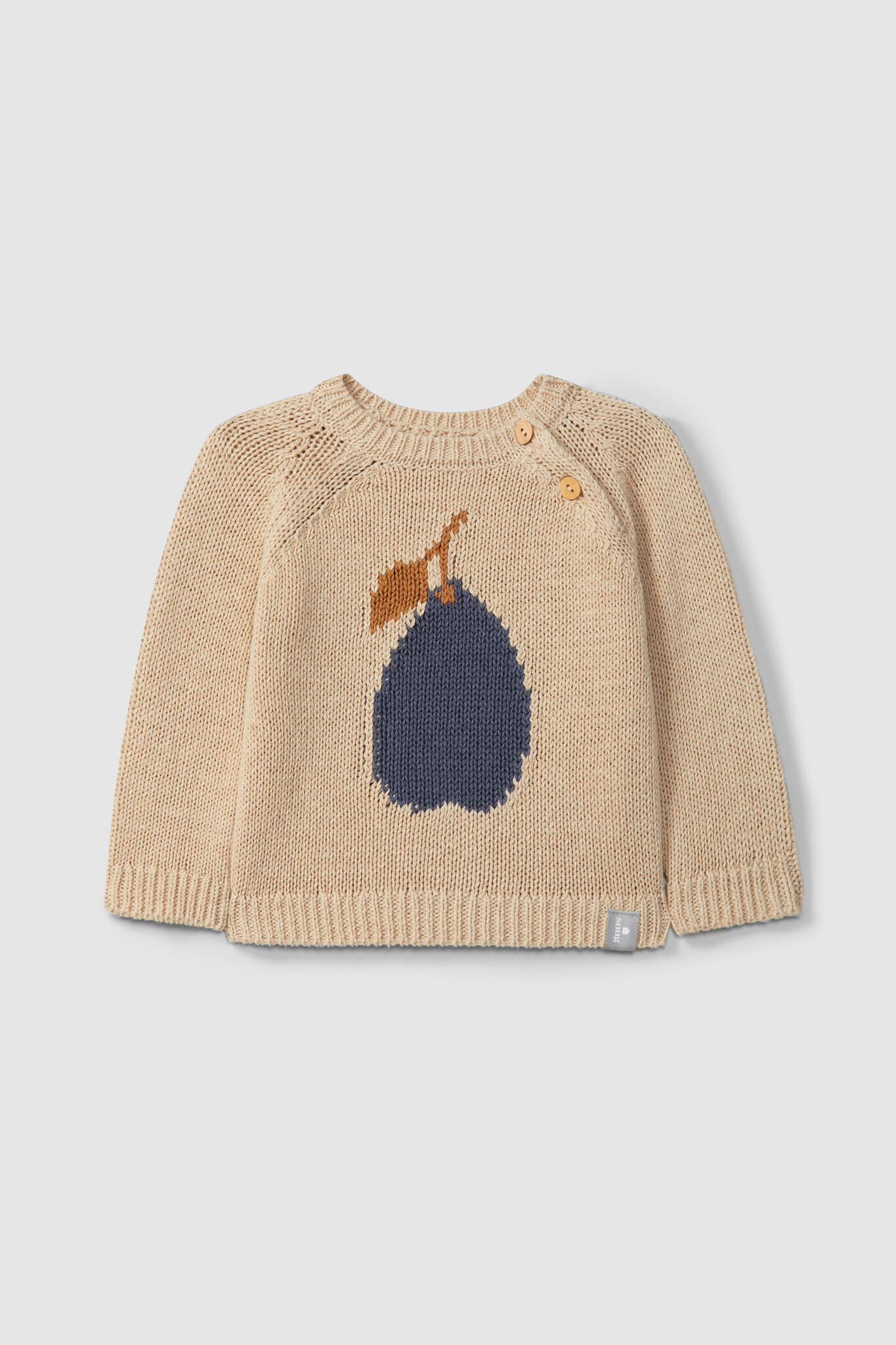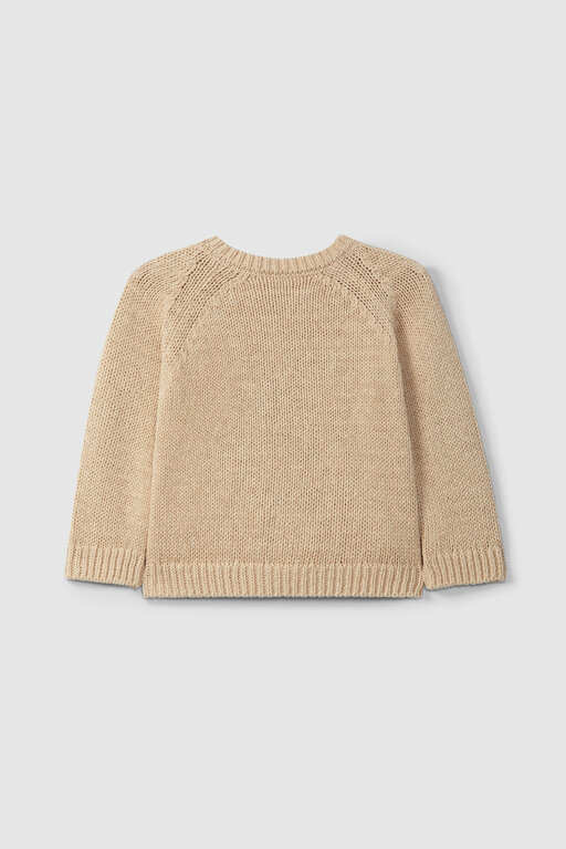 100% recycled cotton handmade effect jacquard knitted jumper. Fastens with wooden buttons at the front up to 18 months.