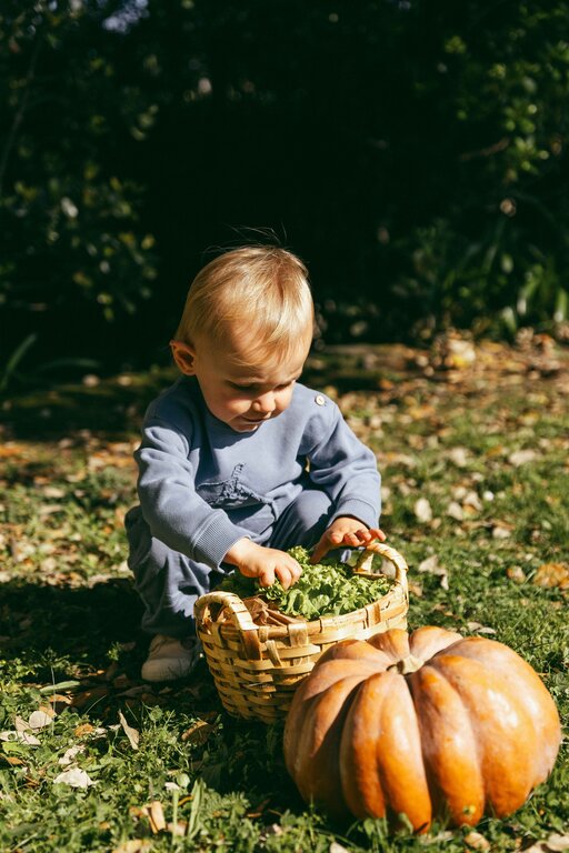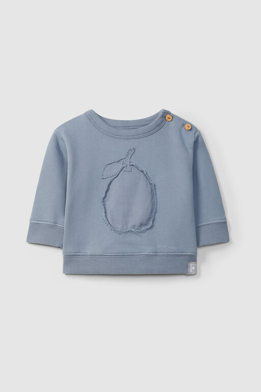 Sweatshirt in 100% organic cotton plush with embroidered appliqué on the front. Fastens with wooden buttons on the shoulder up to 24 months. Ribbed jersey finishes for greater comfort.