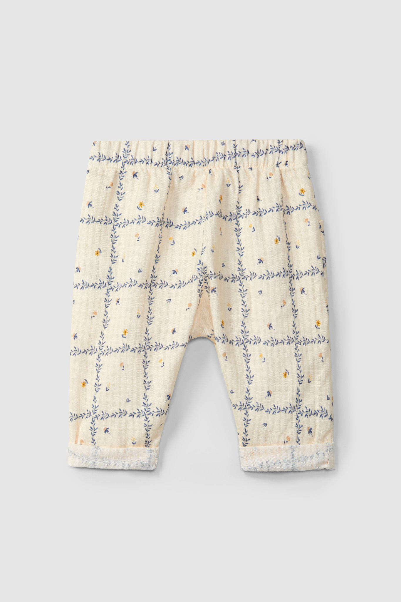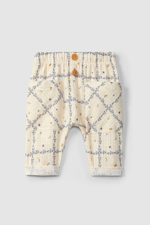 Pull-up pants in 100% soft cotton printed with textured base. Detail of functional front pockets and decorative wooden buttons. Cuffs can be used rolled up or rolled down for added durability.