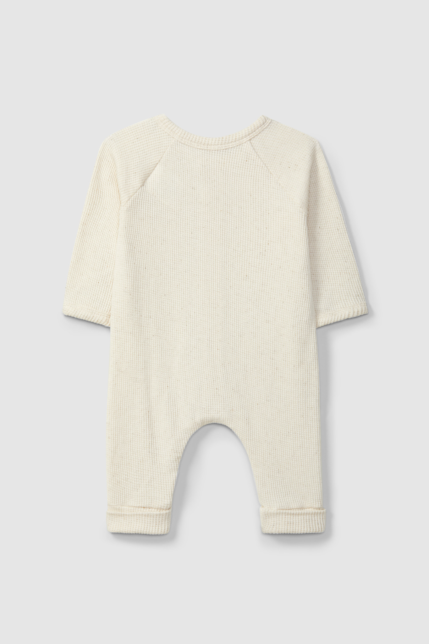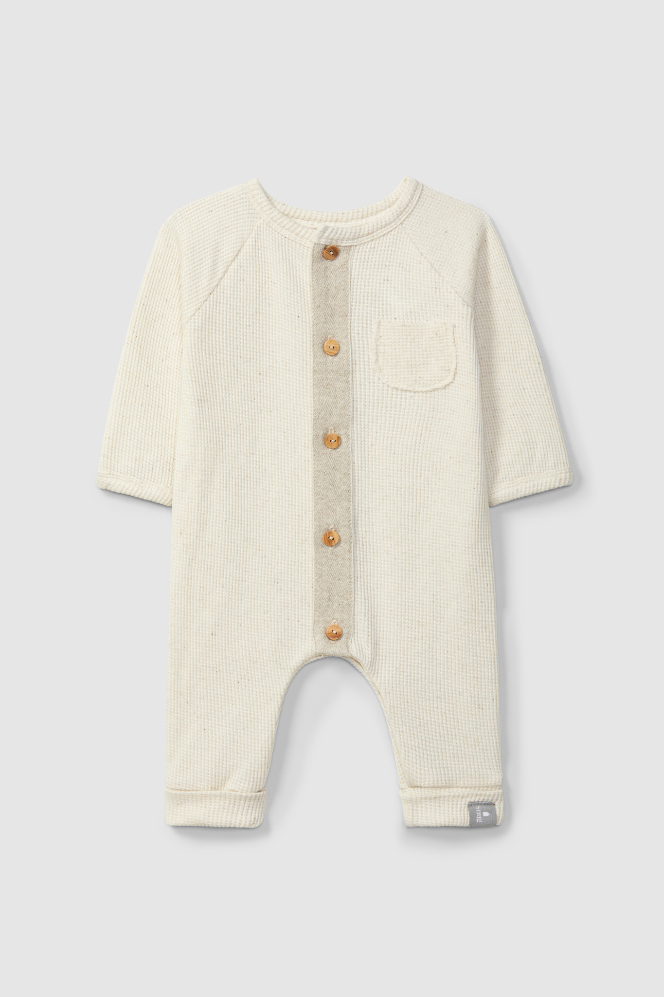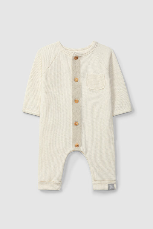 Romper in cotton waffle weave with a touch of linen. Detail of fabric ribbon in contrast colour and functional front pocket. Fastens with wooden buttons and poppers between the legs.