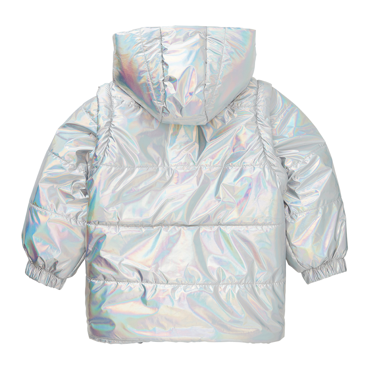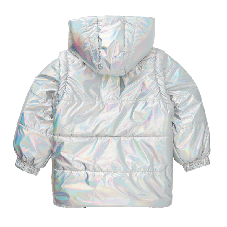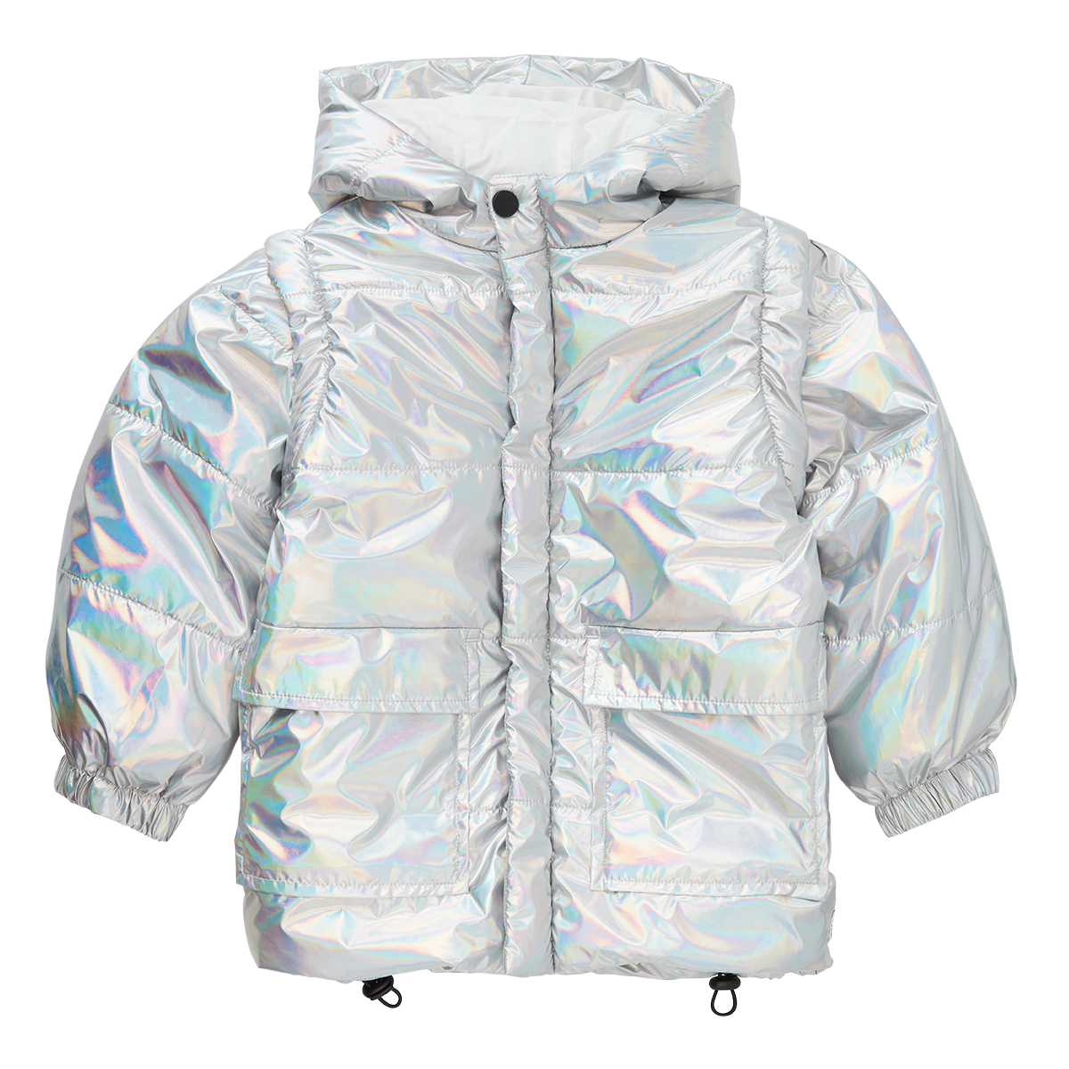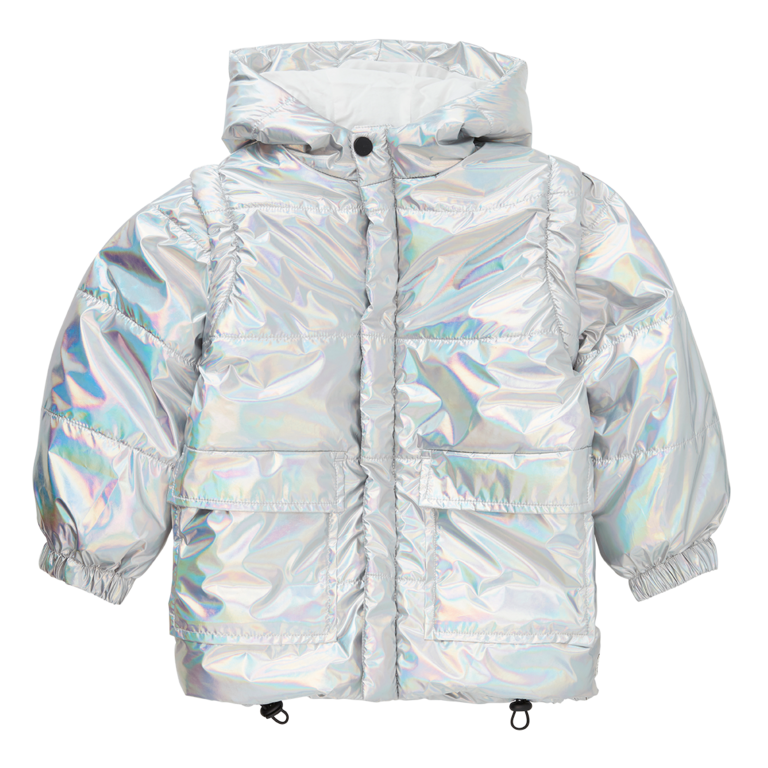 Ready for lift-off? This silver metallic hooded jacket fits right into our space theme. Made from water-resistant nylon with zip-off sleeves that transform it into a cool bodywarmer. A versatile, out-of-this-world piece — just don’t wear it in heavy rainstorms.