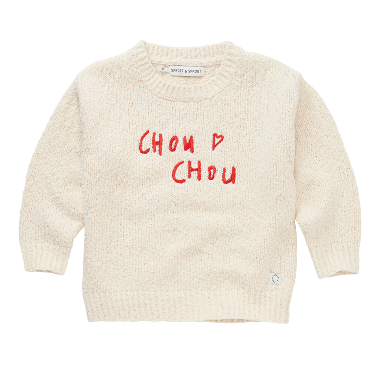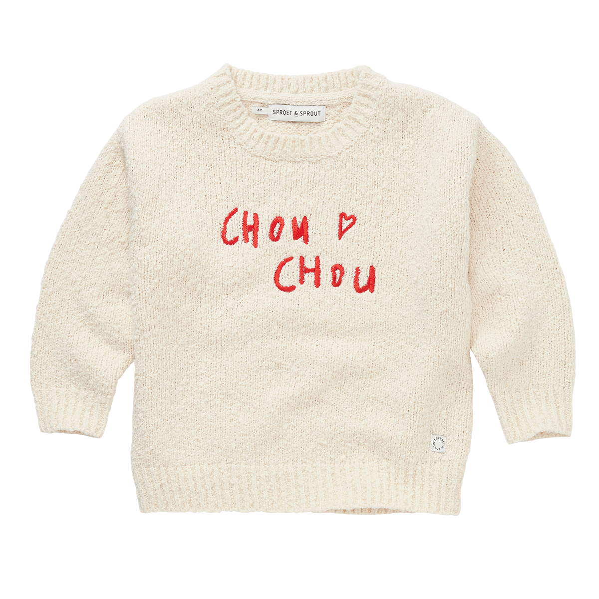 Account aanmakenThis ivory knitted sweater has a cosy bouclé look and is made from a soft cotton blend. Featuring playful ‘Chou Chou’ embroidery on the chest — super cute with a tutu, or styled with jeans for a cooler vibe.