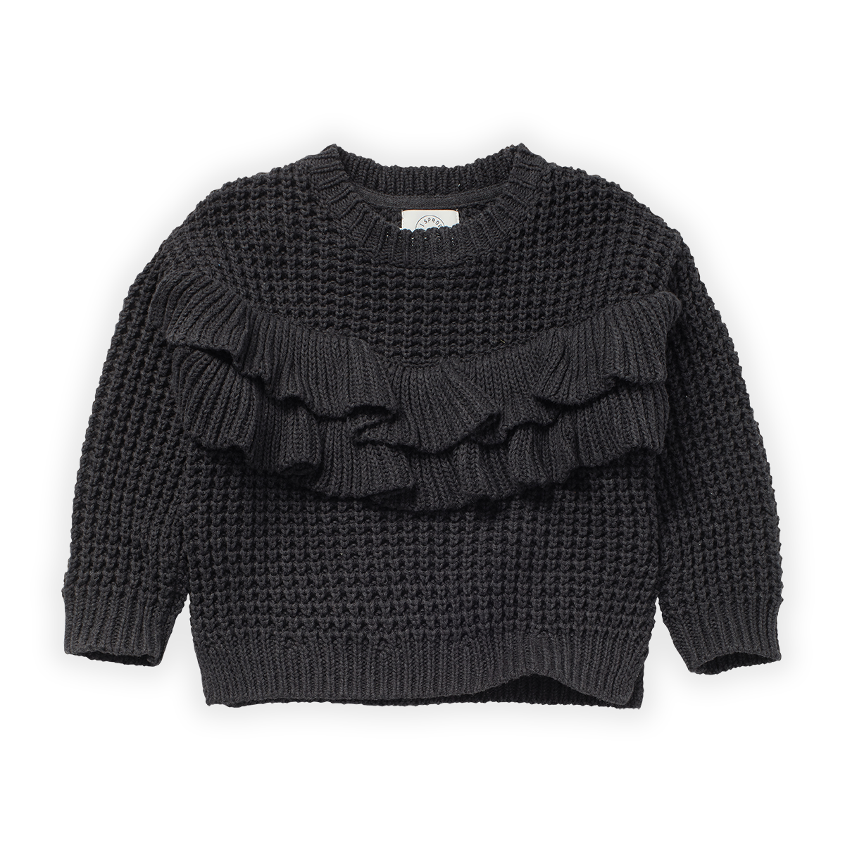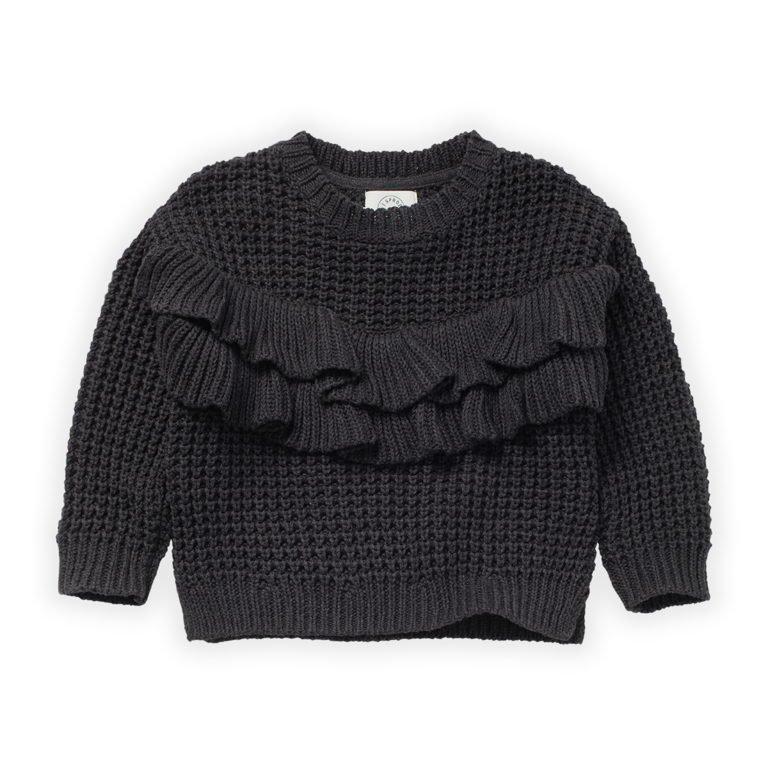 Account aanmakenEen heerlijk warme zwarte gemêleerde gebreide meisjes trui met ruffles. De Sproet & Sprout sweater ruffle asphalt is een perfecte basic wintertrui met een romantische touch maar stoere look. De zwarte ruffle sweater voor meisjes is gemaakt van 100% katoen.
