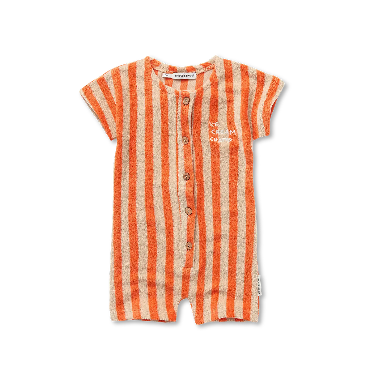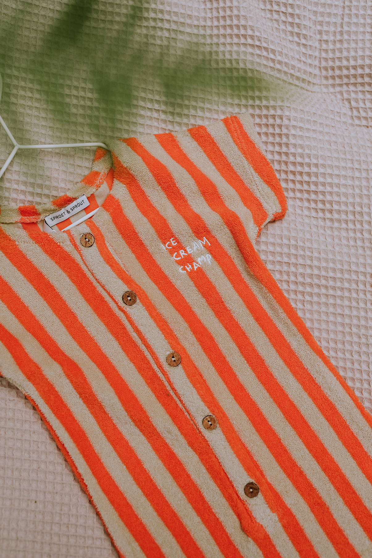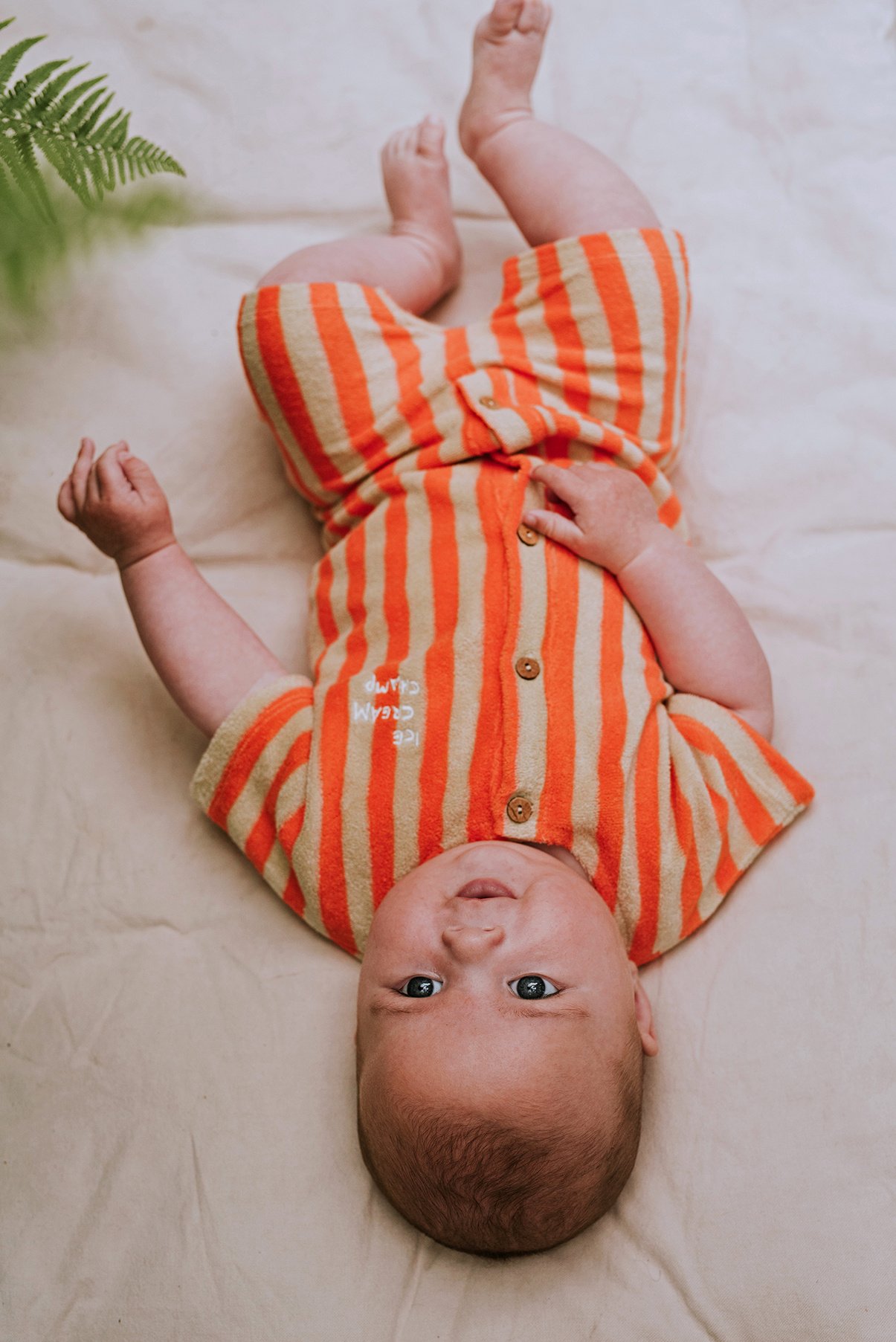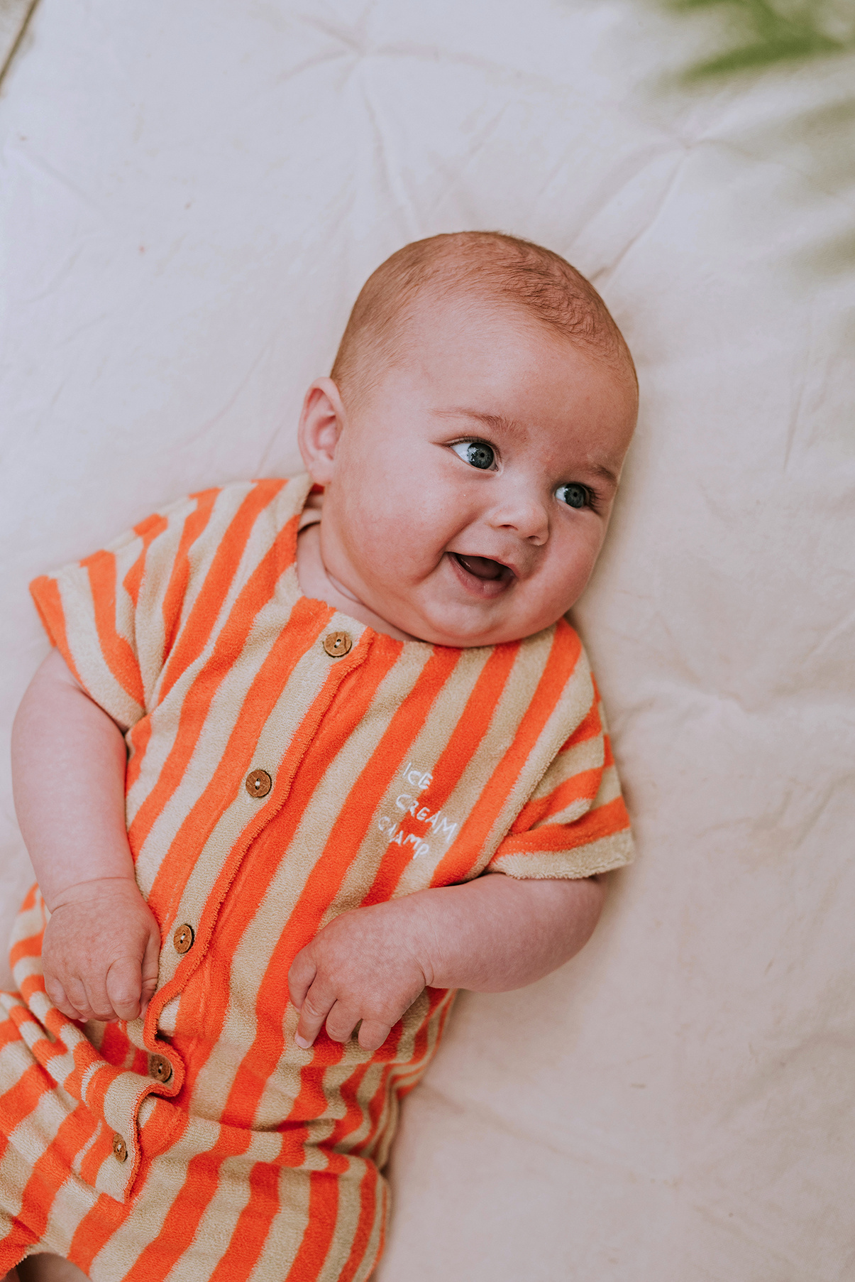 Account aanmakenBright orange stripes, soft terry hugs, and endless giggles — this onesie feels like summer sunshine. Crafted from 100% organic cotton.