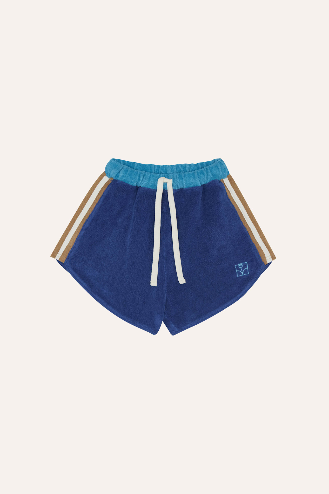 With retro vibes, these blue shorts are made in terry fabric with contrast bands in the sides. They have elastic band in waistband for more comfort. Wear them all summer!