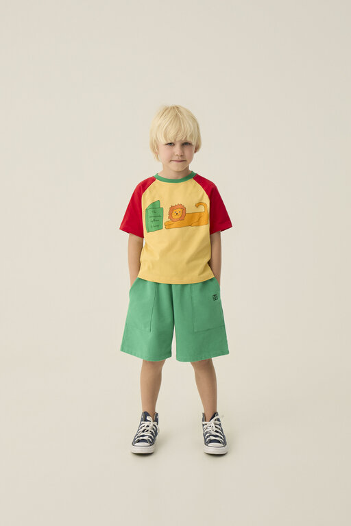 Color block t-shirt made in a very soft cotton quality with a cool print of a lion enjoying a quiet reading. Rounded neck and red short sleeves perfect to complete the summer outfits.