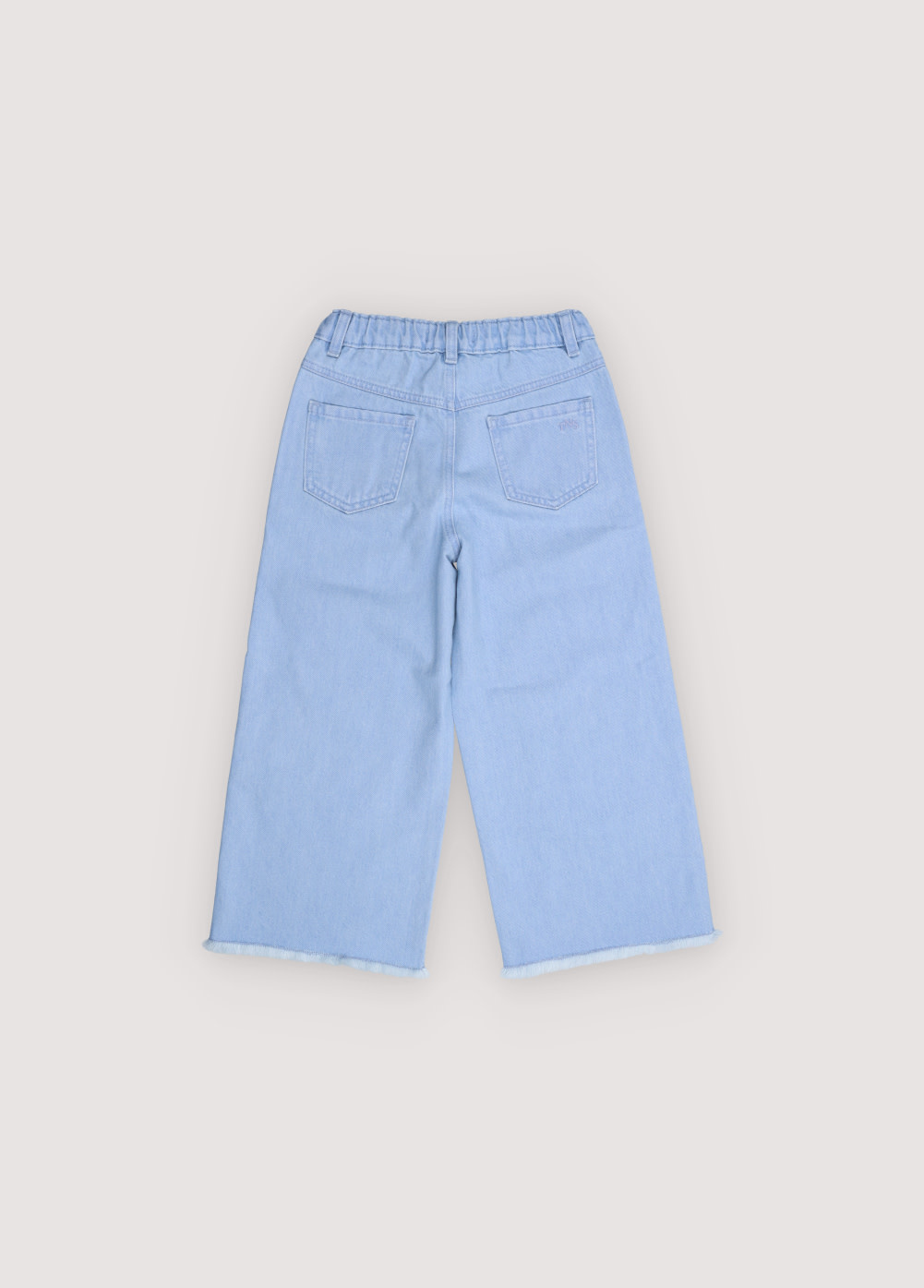 Wide leg denim pants in a soft washed finish, featuring straight legs and an adjustable waistband with interior elastic. Includes front and back pockets and a subtle embroidered detail on the back.